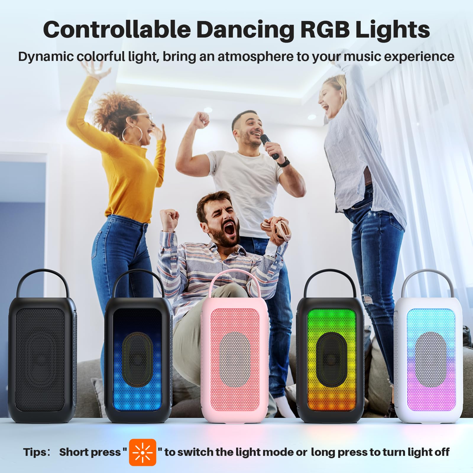 - Ambient RGB Light: This wireless speakers with bluetooth has 4 types of LED light modes. It can change with the rhythm of music, or gentle slow flashing, providing the most romantic and vibrant karaoke party atmosphere for you. You can also long-press the LED button to turn off the light.