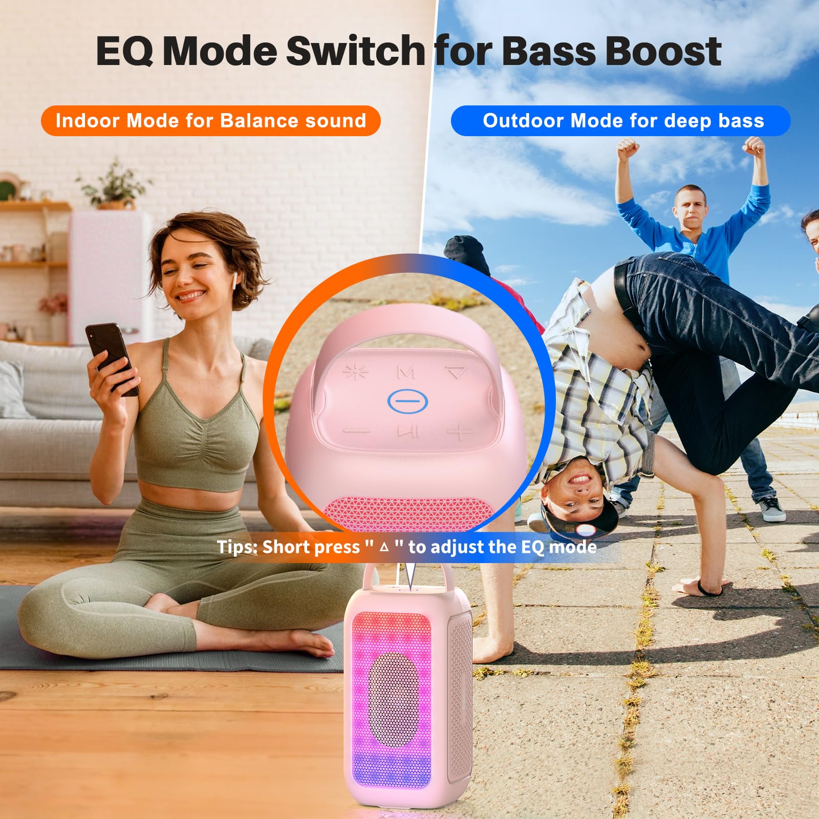 - EQ Adjustable: You can switch EQ to indoor or outdoor mode given your need. Outdoor mode delivers much power bass, and Indoor mode offers crisp and well-balanced sound. Making it the perfect speakers bluetooth wireless for any indoor event and an excellent singing speaker for small outdoor party
