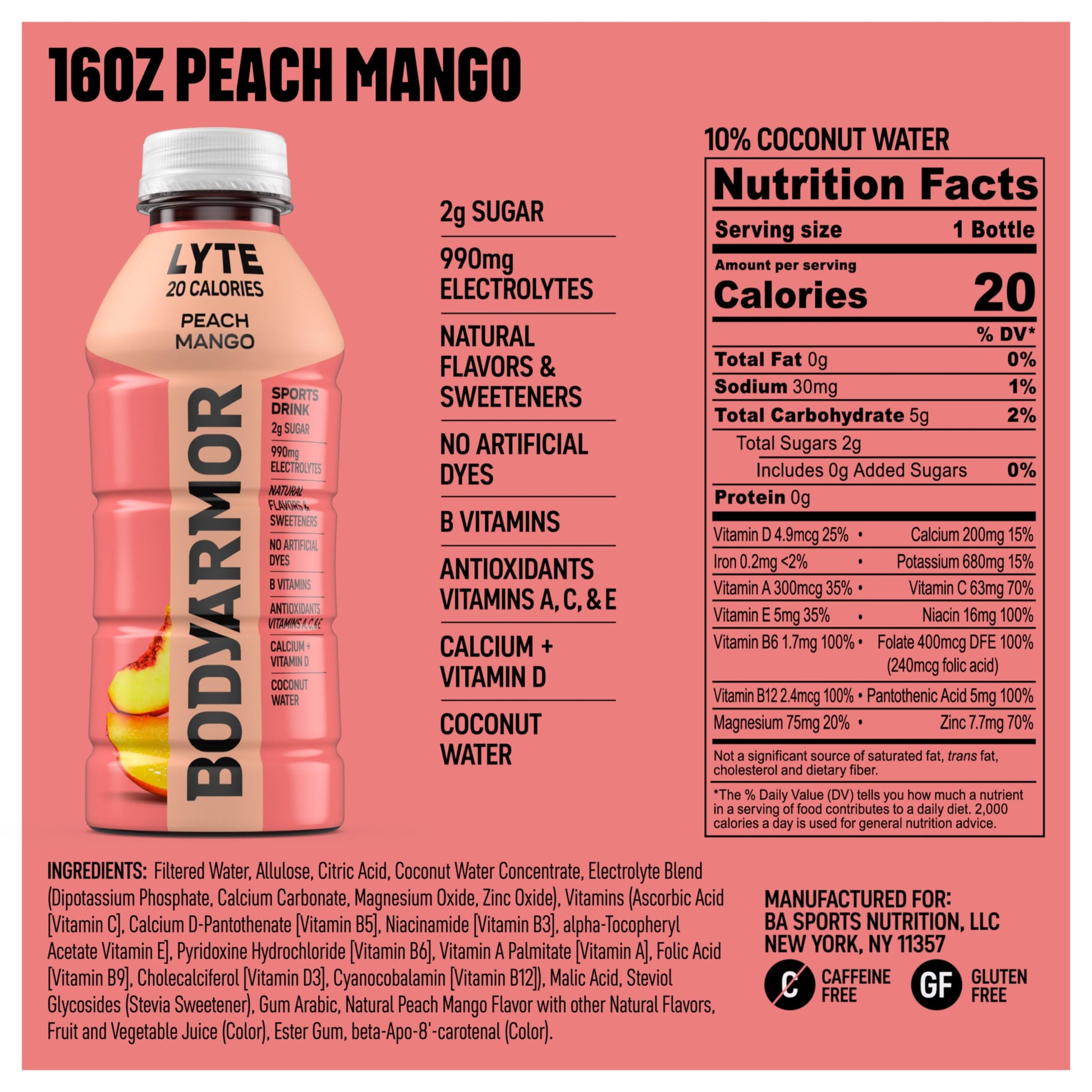- 12 pack, 16 fl oz bottles of BODYARMOR Lyte Peach Mango electrolyte drinks for hydration that keeps pace with your active lifestyle