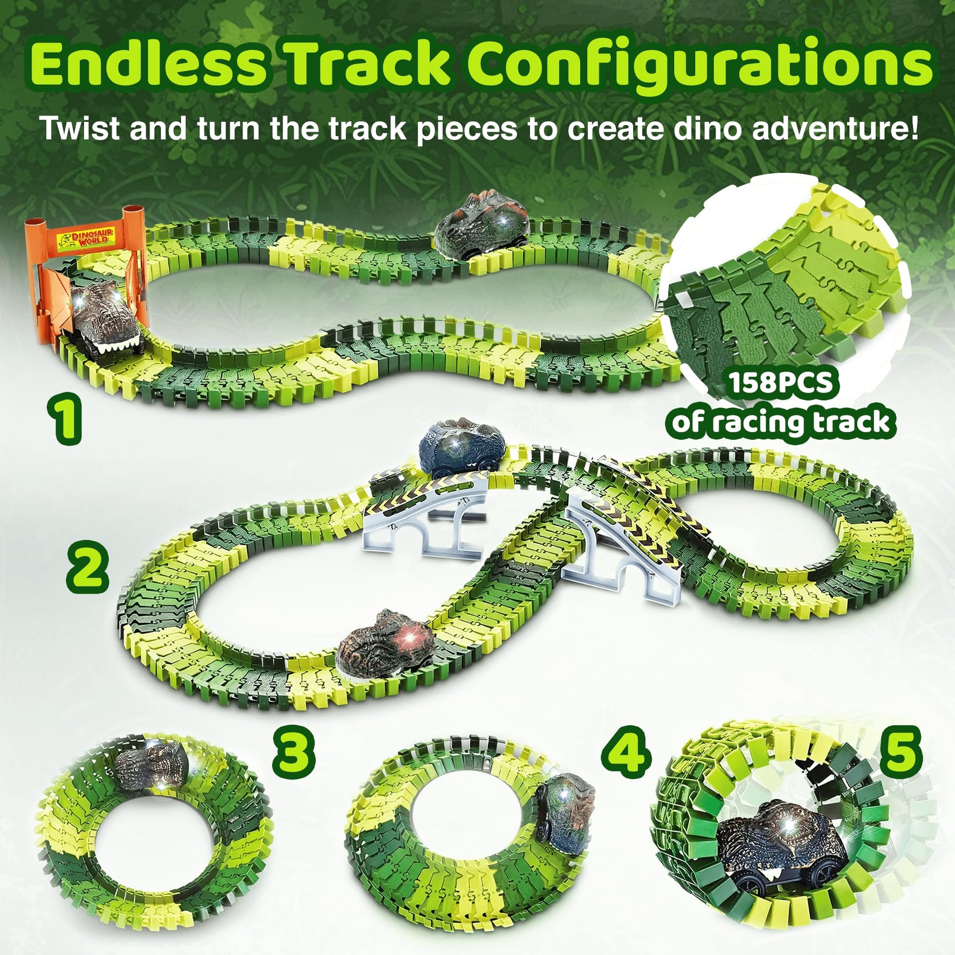 - Comprehensive Set: This dinosaur track set includes 158 flexible track pieces and 12 accessories, featuring a dino train and magic car tracks. Race tracks for kids ages 3-7, it offers flexible race track easy-to-connect parts for endless track layouts, perfect for indoor and outdoor play, ensuring extend play of exploration and excitement. This dinosaur car track set is also a car tracks for toddlers 3-4 years.