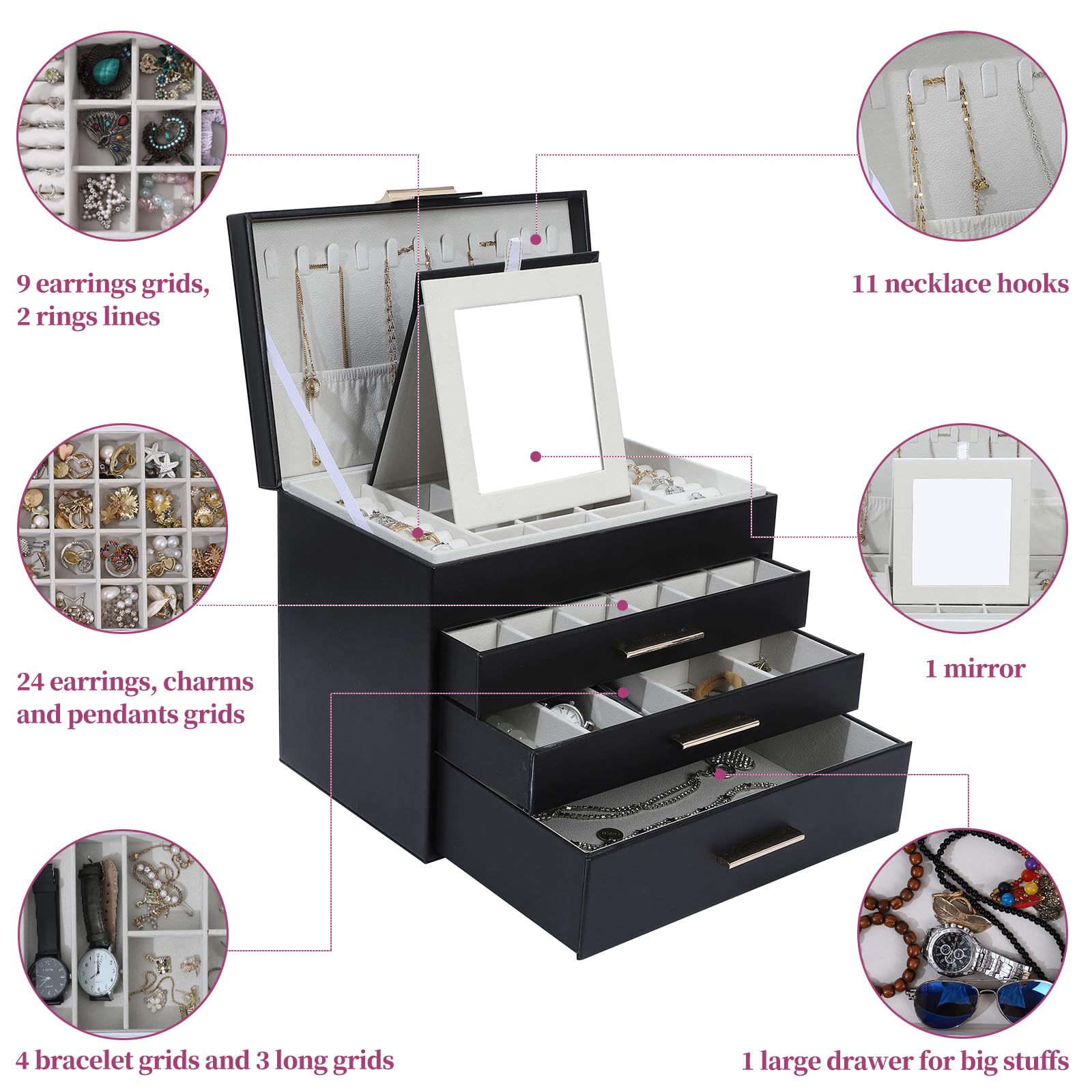 - 4 Layer Large Jewelry Box : The first layer of the box has 2 ring lines, 1 mirror , 11 necklace hooks and 9 earrings grids. The mirror is perfect for your daily makeup.
