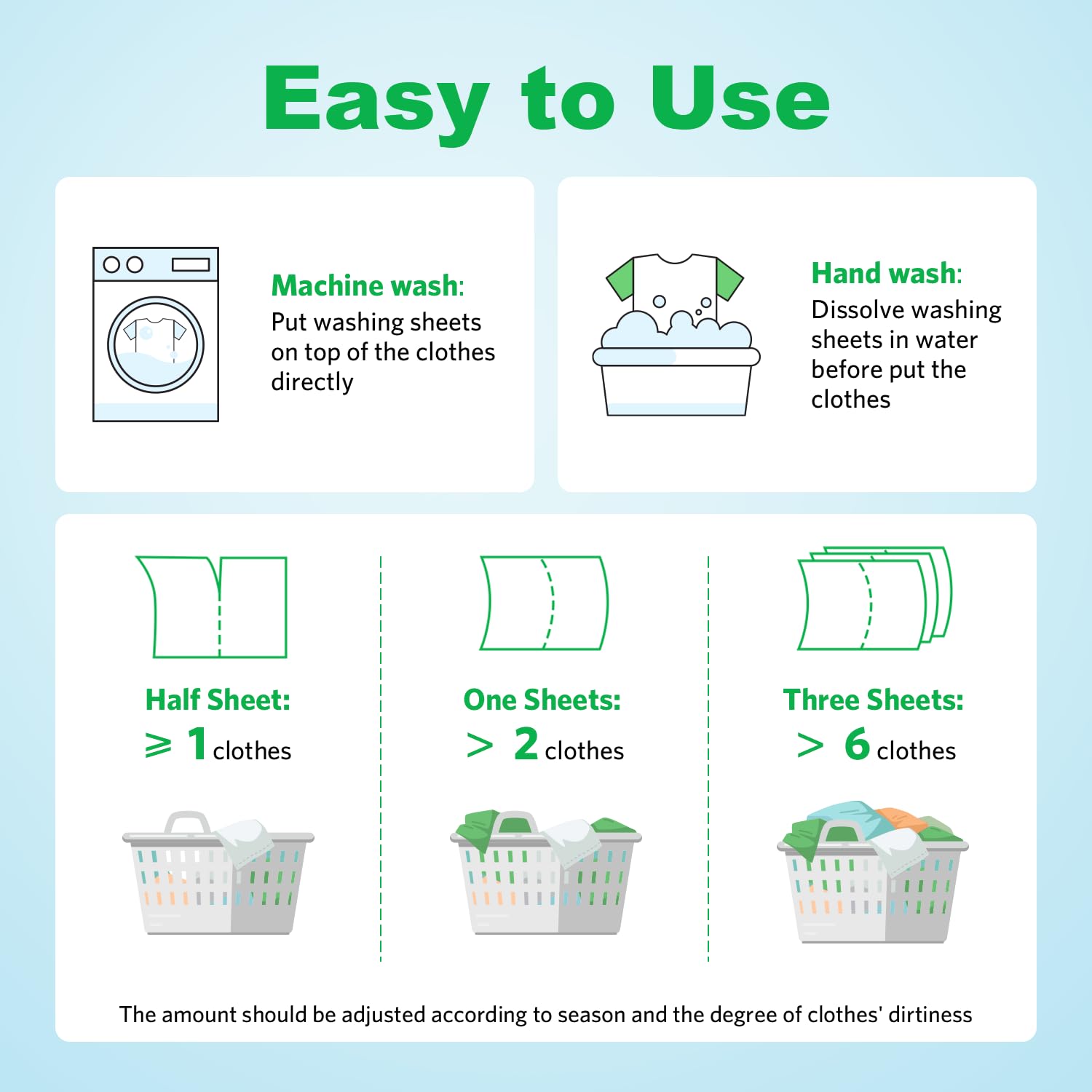 - EASY TO USE: Every piece of laundry detergent sheets has been pre-cut and pre-measured, just place the laundry sheet on clothes then start machine, NO measuring, NO wasted laundry detergent; BORMSI laundry detergent sheets dissolve quickly in both hot and cold water, No residue