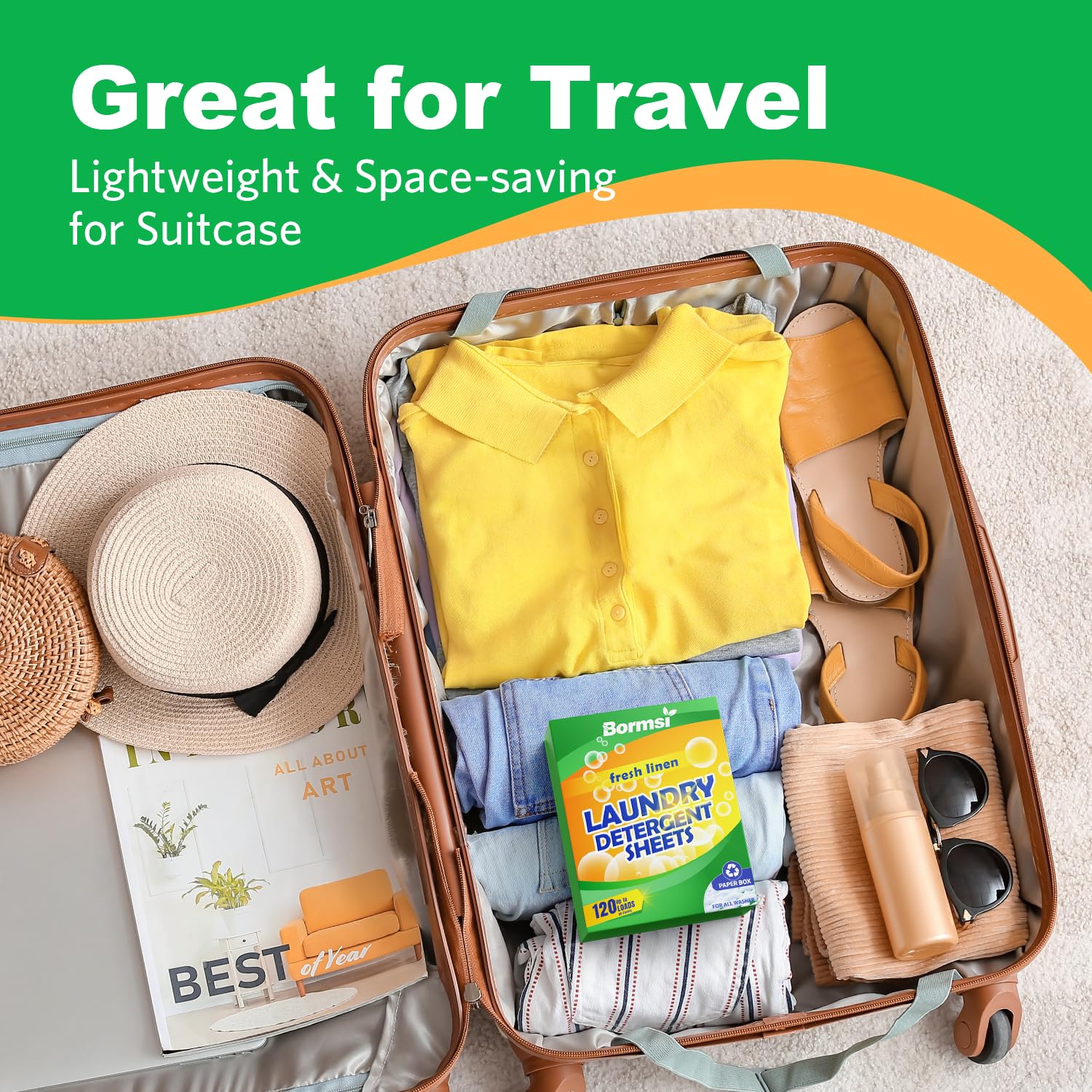 - ๐๐ซ๐๐๐ญ ๐๐จ๐ซ ๐๐ซ๐๐ฏ๐๐ฅ: Say goodbye to heavy & bulky plastic jugs, BORMSI laundry detergent sheets is liquidless, no drips or spills; our laundry detergent sheets is space-saving for suitcase as well as your laundry room, is an ideal travel laundry detergent for your trips