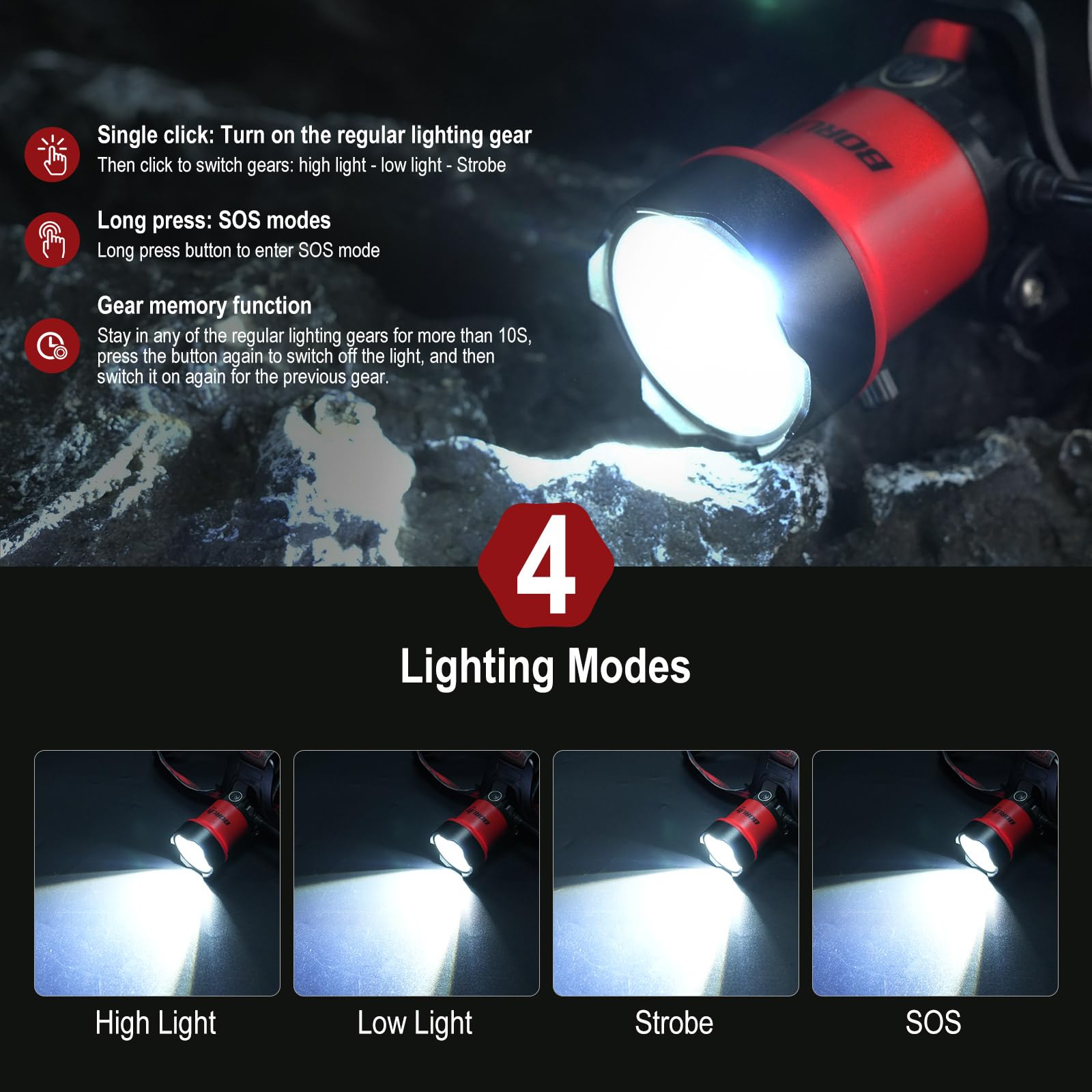 - 4 Lighting Modes with Memory Function:The head lamp features High, Low, Strobe, and SOS modes for various needs. The memory function recalls the last used mode—no need to reset. Built-in SOS whistle adds an extra layer of safety in emergencies