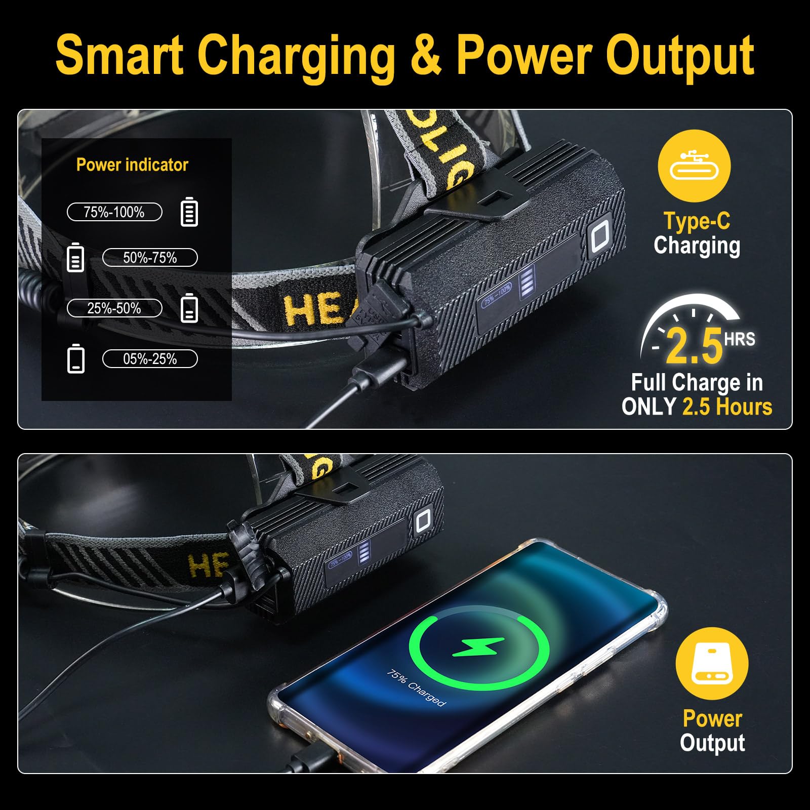 - USB-C Fast Charging Rechargeable Headlamp : Equipped with 2 pcs rechargeable battery and USB-C fast charging, the led headlamp fully charges in just 2.5 hours, offering up to 3-10 hours of runtime depending on the mode. The battery indicator keeps you informed about power levels, ensuring continuous use during your adventures.