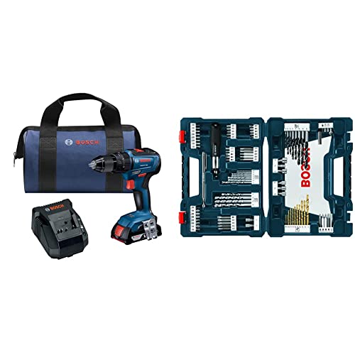 BOSCH GSB18V-490B12 18V EC Brushless 1/2 In. Hammer Drill/Driver Kit with (1) 2.0 Ah SlimPack Battery&BOSCH 91-Piece Drilling and Driving Mixed Set MS4091
