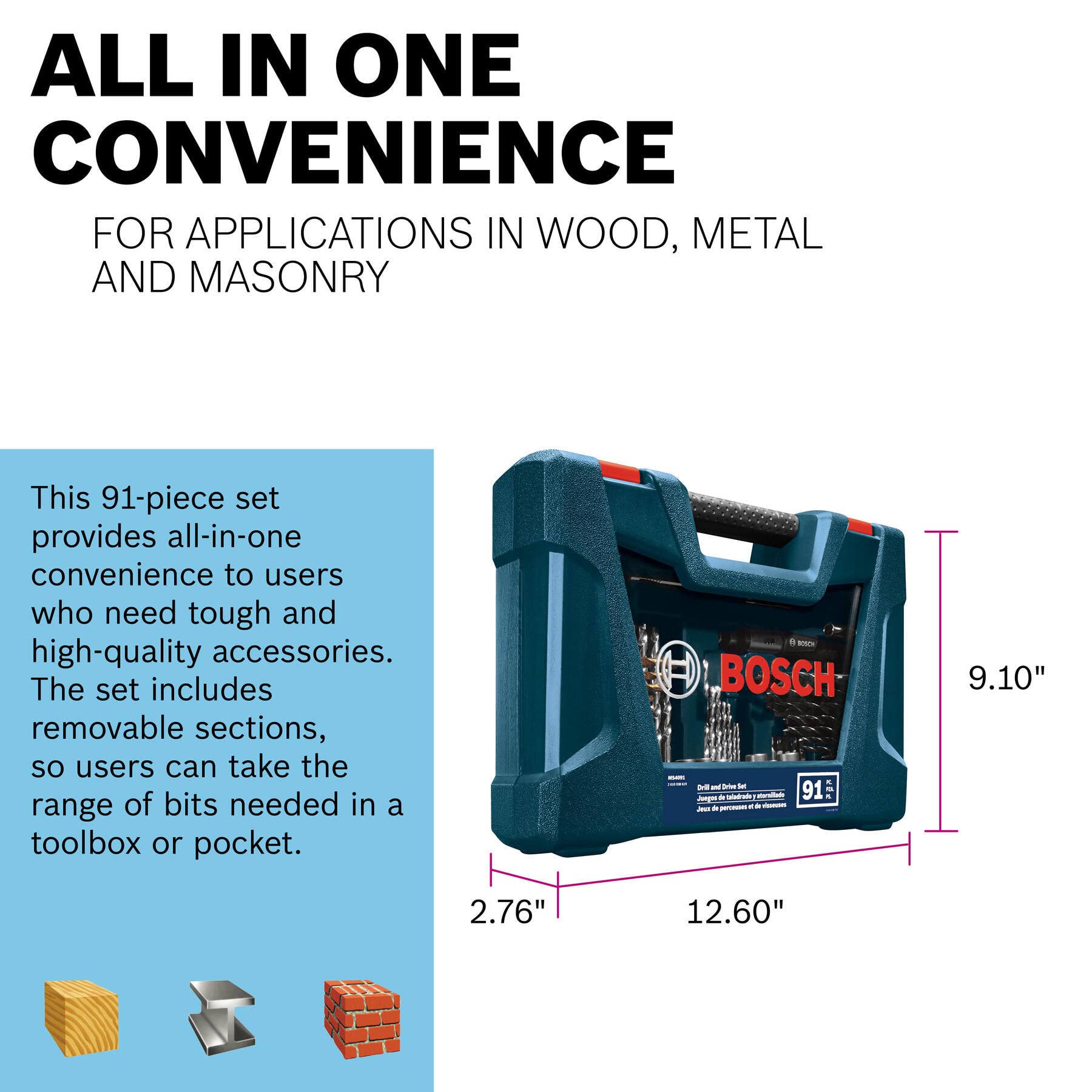 Details: The Bosch Drilling and Driving Mixed Bit Set features driver and drill bits for all-in-one convenience. This set also comes with a variety of accessories to help solve general drilling and fastening tasks. The included driver bits are designed to lessen damage to the screw head, with better bit-gripping power. This set provides drill bits for applications for wood, metal and masonry. It also provides an easy-to-use case, to help the user organize the bits.