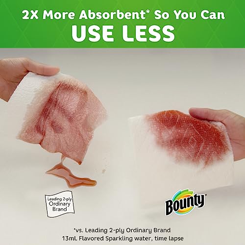 Details: "Spilled your drink? Quick! The Quicker Picker Upper. Be ready to tackle messes and spills with Bounty Paper Towels! Each sheet is 2x more absorbent, so you can use less and pick up spills and messes quicker than the leading ordinary brand. That’s why Bounty is the Quicker Picker Upper! Bounty Paper Towels are available in two sheet sizes, Full Sheet and Select-A-Size, so you can choose which option works best for you. Bounty Select-A-Size towels are versatile, so you can choose your sheet size depending on your mess. And if you’re buying the bigger packs, you’ll always have Bounty on hand. Bounty has a variety of pack and roll sizes to fit your needs. Bounty products are proudly made with American jobs and we’re fully committed to creating solutions for a sustainable future. Across all our products, we consider the impact on people, forests, and the world. That’s why for every tree we use, at least two are regrown so you can conveniently and confidently clean messes in the kitchen and around the house knowing Bounty Paper Towels is helping to keep forests greener. Bounty always has your back in and out of the kitchen so whether it’s juice on the counter or ice cream on the table, we make sure spills won’t stand a chance. *vs. leading ordinary brand"