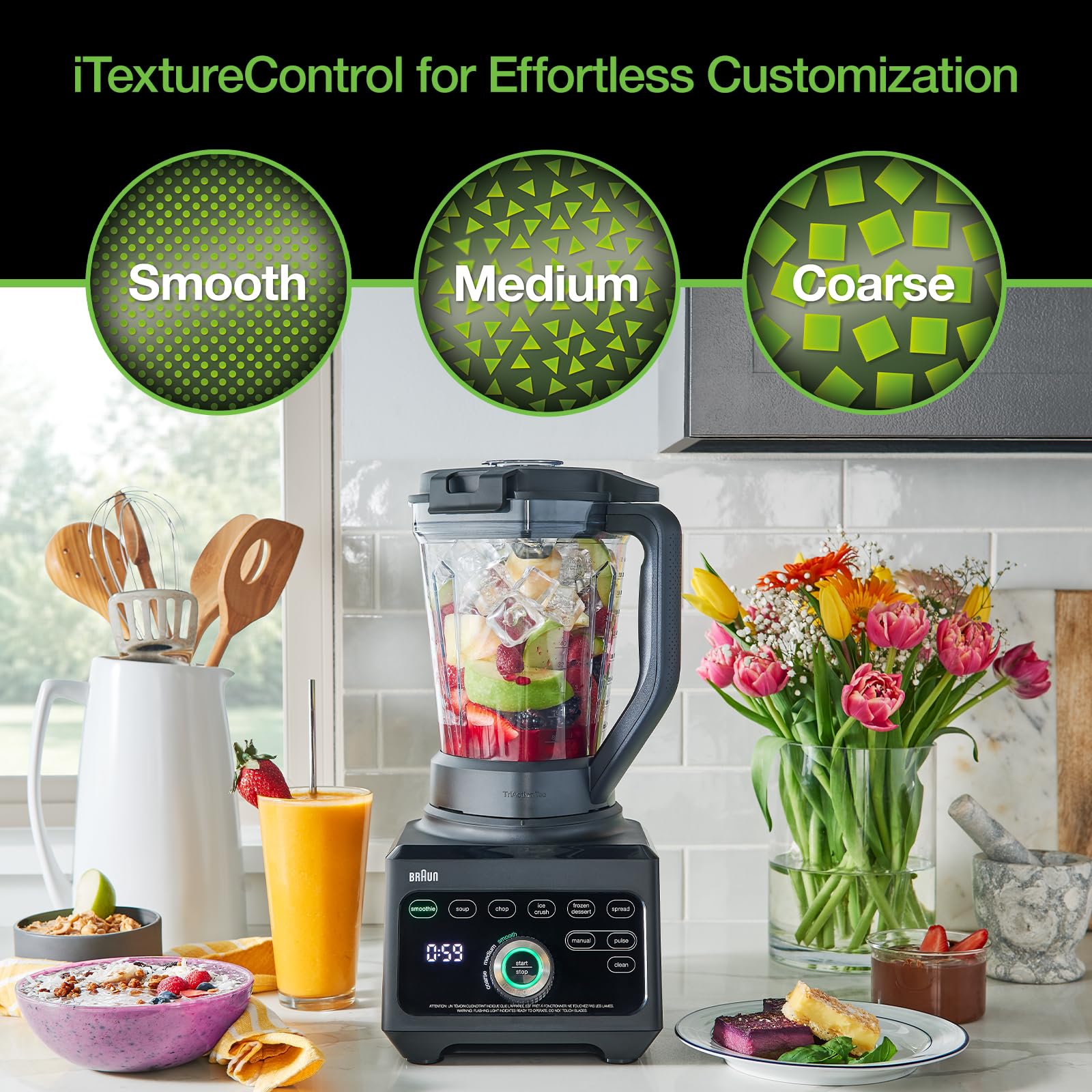 Details: The all-new Braun TriForce Power Blender is a powerhouse kitchen performer with superior speed and selection for an effortless personalized blending experience beyond compare. The first-ever power blender to feature a TriAction technology jug, designed with a triangular shape with the long lasting, durable Tritan™ material. This sophisticated engineering guarantees 60% finer and 4x faster blending*. The seamless intuitive interface makes it easy to quickly master recipes thanks to the iTextureControl functionality. Simply select any one of the 6 automated programs to start, then choose between one of 3 unique texture settings – smooth, medium or coarse - for 18 possible blends as precise as your palate. It also has a smooth hot soup setting that simultaneously heats as it spins, resulting in the perfect soup texture and warm temperature, every time. It’s just one of many versatile features this Braun power blender brings to the kitchen. The blender’s innovative technology is supported by 1600 watts of continuous power and premium stainless steel blades forged in Solingen, Germany. The sharp PrecisionEdge Blades effortlessly emulsify the toughest ingredients like hearty root vegetables and dense chunks of ice, ensuring everything from silky smoothies to savory spreads are equally enjoyable; while the durable motor system also offers 10 manual speed settings, plus a multi-speed pulse function to bring every foodie craving to fruition. With the included Smoothie2Go bottle, you can blend directly in the 20oz tumbler and take it with you the go. And just like every dish needs a finishing touch, this blender delivers with a built-in clean button that’s both user-friendly and functional. Even the durable touch screen is a wipe clean surface. With the included 5 year warranty, it’s easy to see why the innovative Braun TriForce Power Blender is the accomplished culinary sidekick your kitchen’s been searching for. *Compared to the Braun JB7201