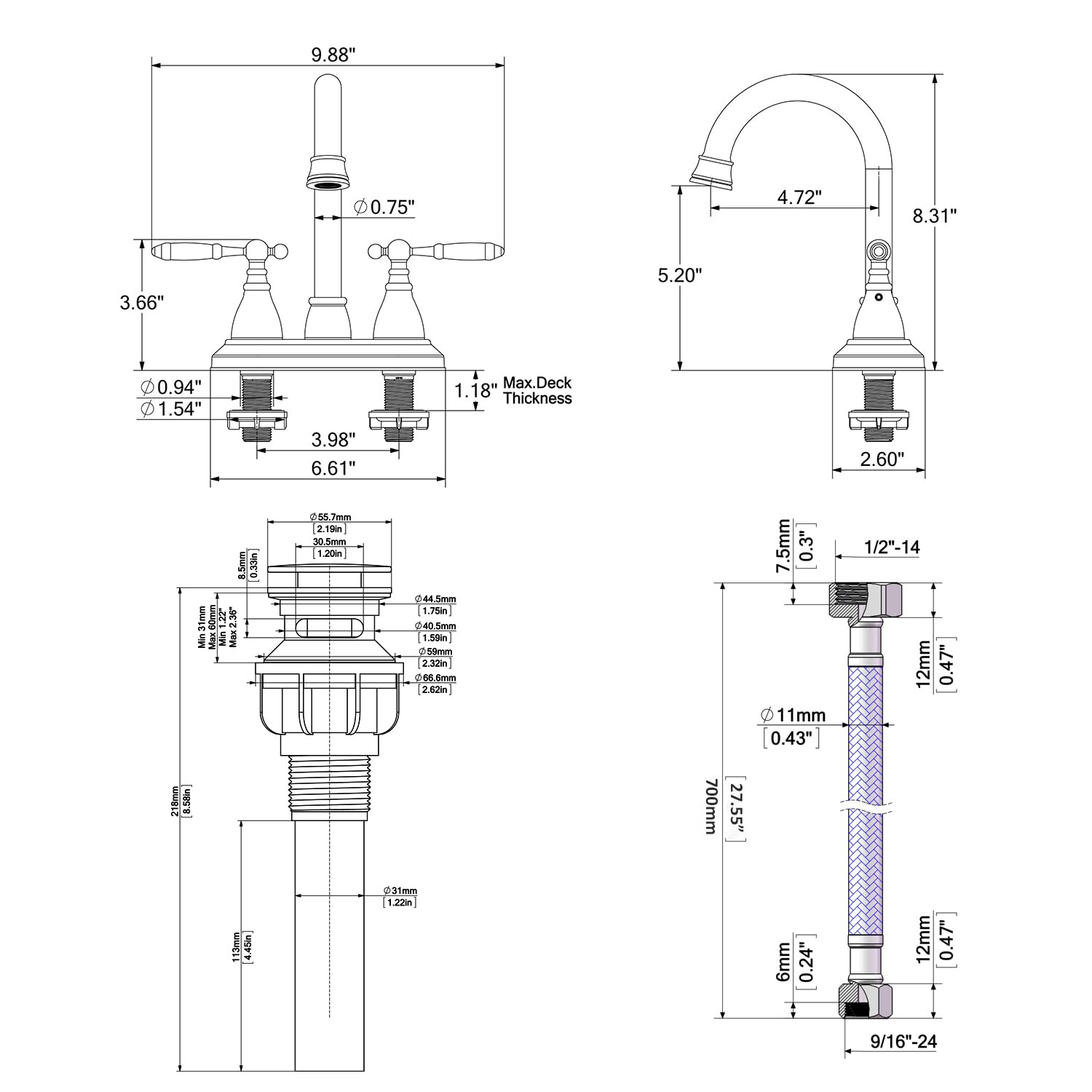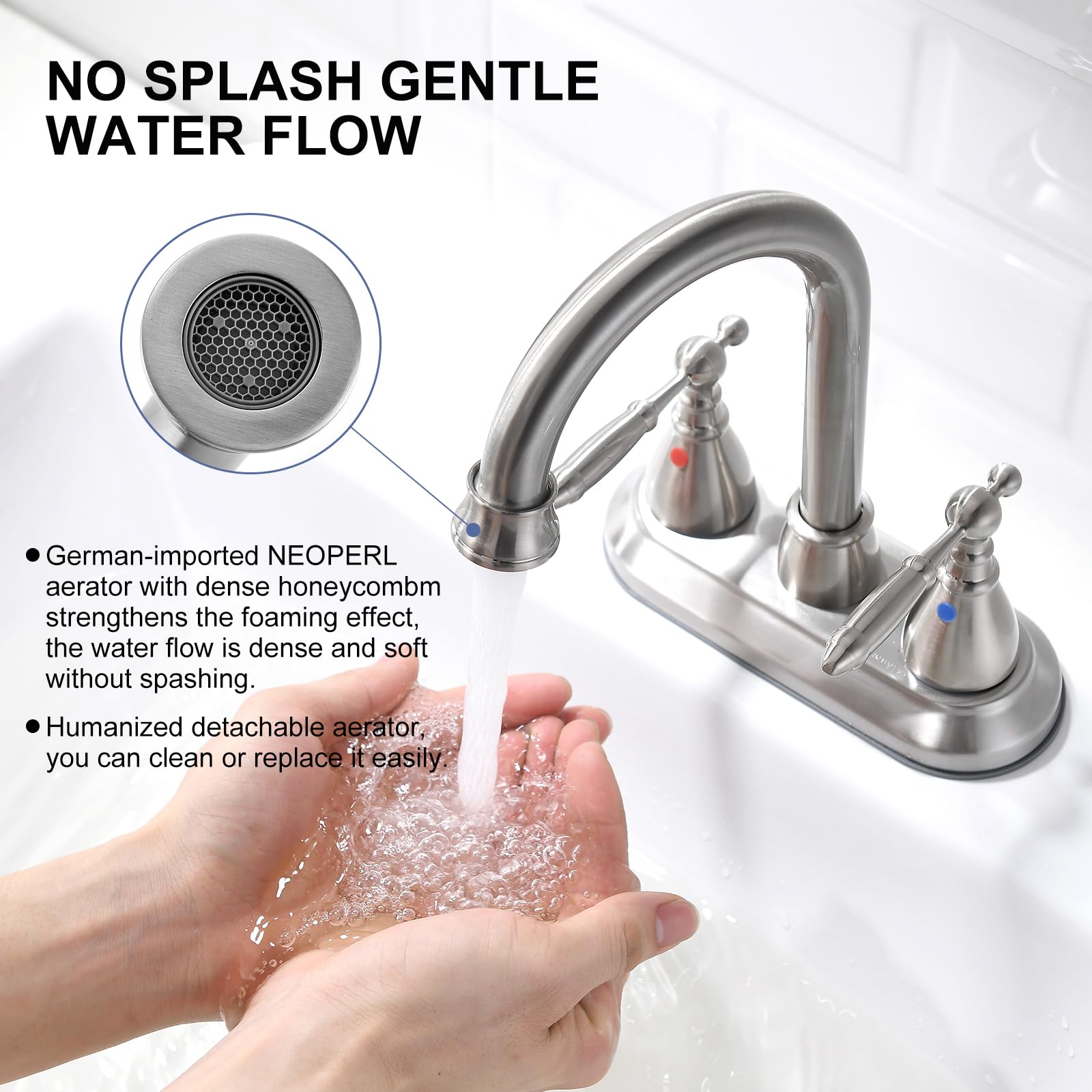 - Easy to Install: The 4 inch bathroom sink faucet comes with hot&cold inlet water hoses. This deck mounted 2-hole brushed nickel bathroom faucet is very easy to install and clean