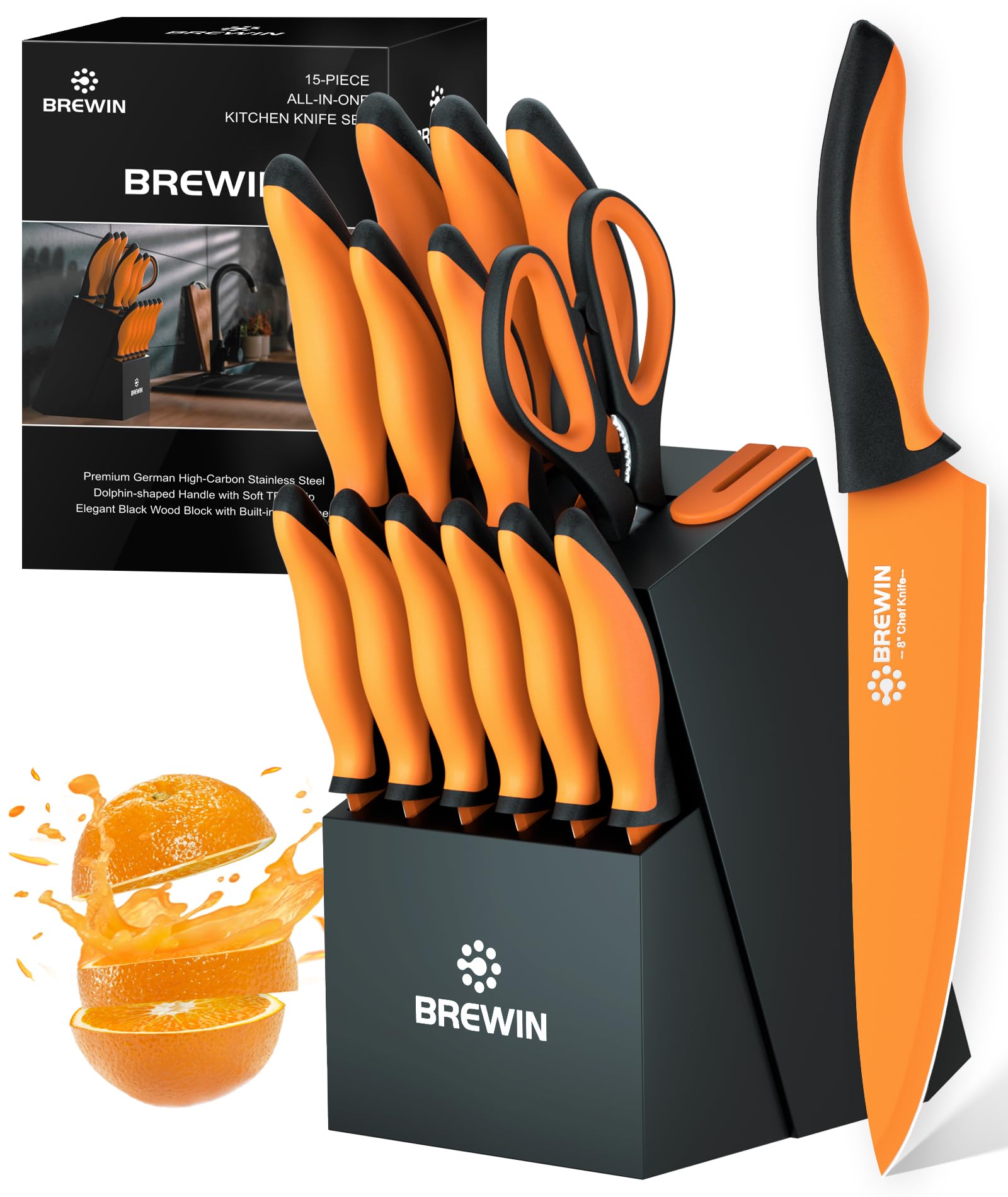 Brewin Knife Set, 15-Piece Kitchen Knife Set with Block, German Stainless Steel Sharp Knives Set for Kitchen with Built-in Sharpener, Ergonomic TPR Anti-Slip Handle
