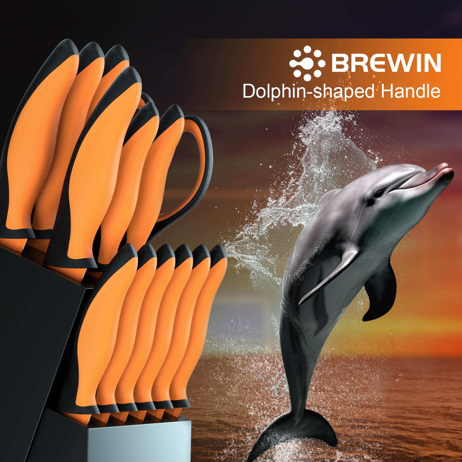 - ERGONOMIC ANTI-SLIP HANDLE - Our Dolphin-Shaped ergonomic handle with colorful soft Santoprene grip provides the most comfortable and firm hold. Our knife set will turn your kitchen work into a pleasure. Our knives are colorful, so is our life!