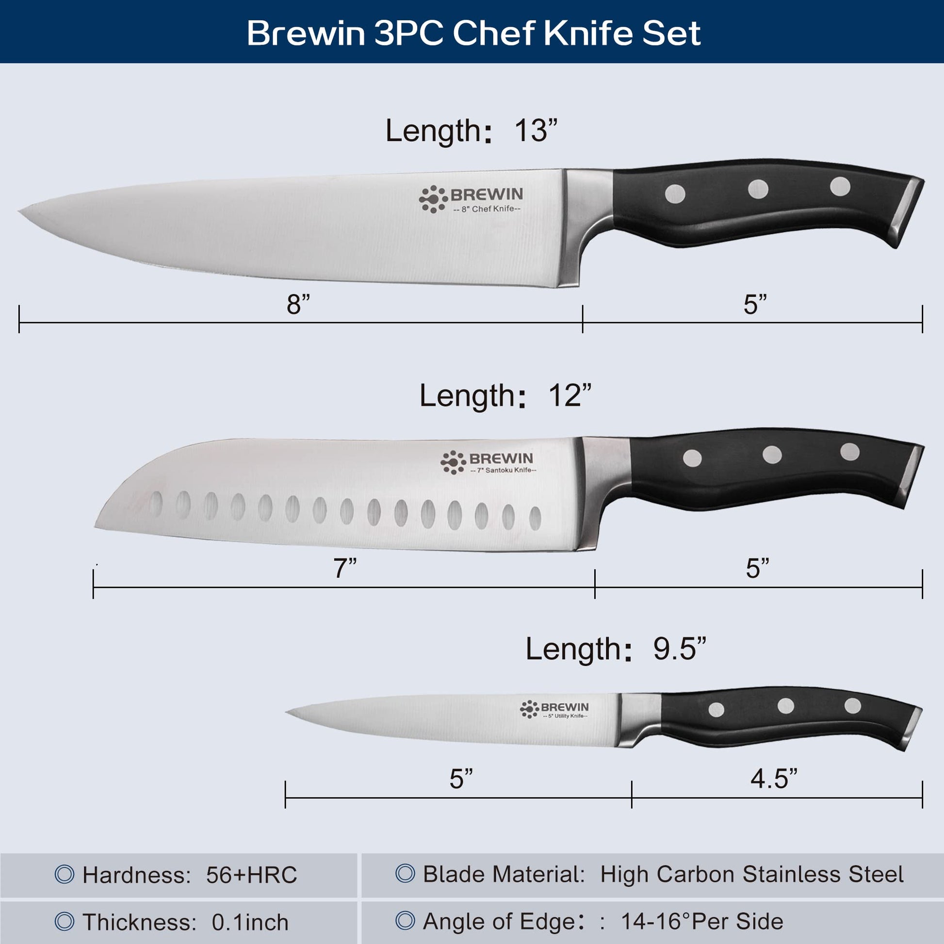 - MUTI-PURPOSE CHEF KNIFE SET - The Brewin 3pc Professional Kitchen Knife Set comes with 1× chef’s knife, 1× santoku knife, and 1x utility knife and will be your best cooking mate. The knife set can easily handle all your daily kitchen tasks as the versatile knives let you enjoy cutting, carving, slicing, chopping, and mincing meat, fruits, vegetables, and more. This luxurious Brewin boxed carving knife set is the best gift for your loved ones.