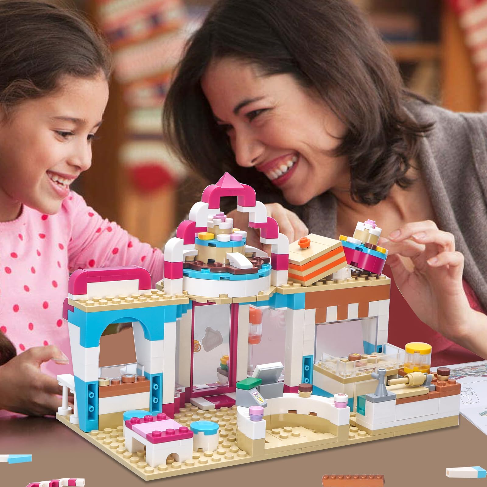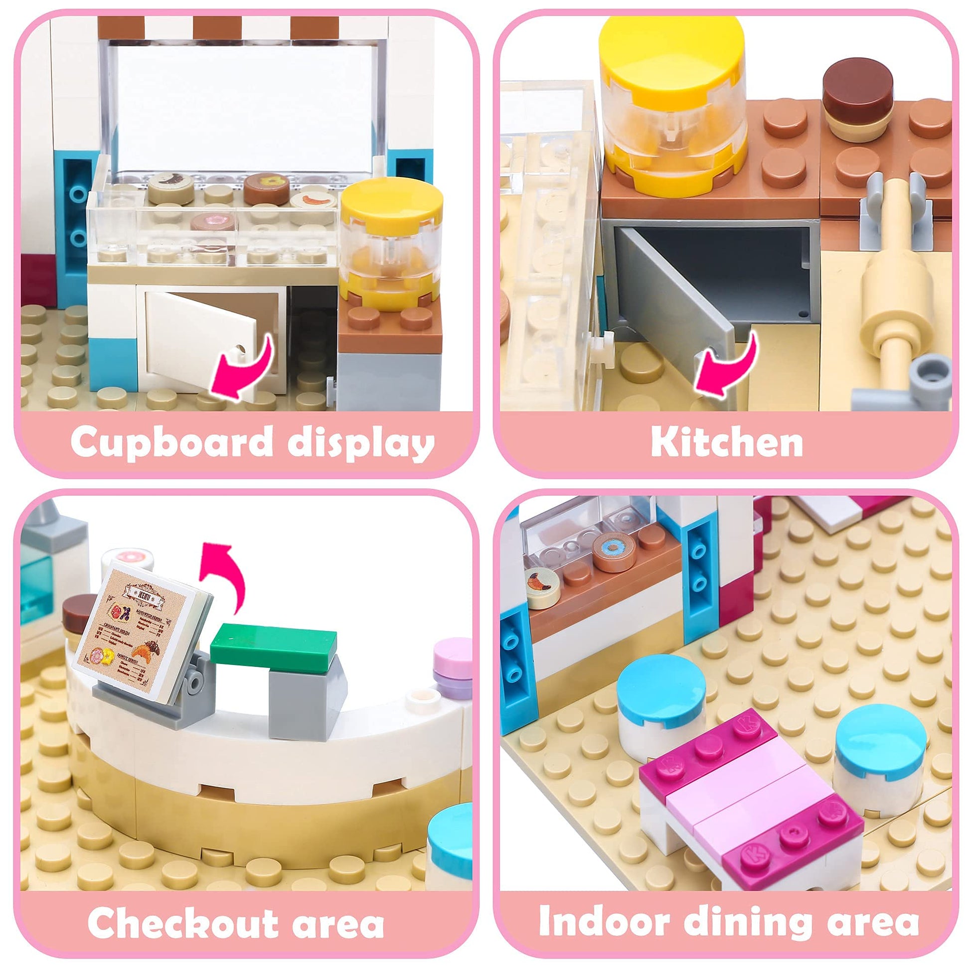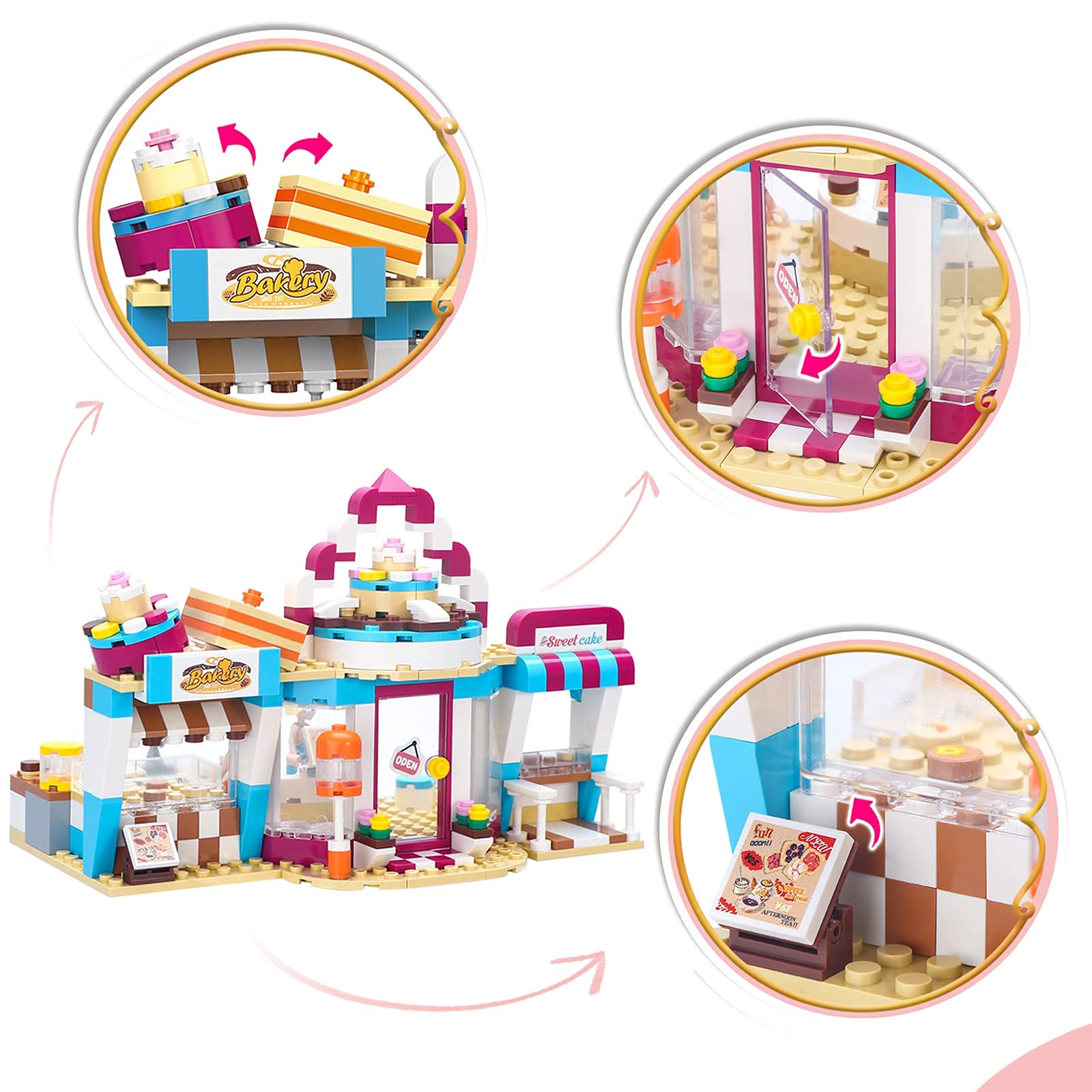 - š„Fun Bakery Shop Playset - Build a brightly colored bakery including a sign decorated with cakes, a bread making area, shop window, sales kiosk, dining area and checkout area. Comes with lovely details: oven, rolling pin, sink, dessert and cash register.
