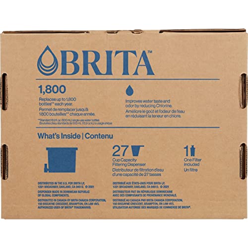 Details: Description Drink cleaner*, great tasting tap water with this Brita 27 cup UltraMax water dispenser. The 9-cup reservoir and the 18-cup body add up to an extra large capacity that makes this water filtration system perfect for busy families, sports teams and offices, while the space efficient design allows for convenient storage. Made without BPA, and includes one Brita Standard Filter. The Standard Filter reduces chlorine (taste & odor), mercury, copper, and more** to deliver great tasting water. Designed to leave no black flecks in your water and with no pre-soak required, the Brita filters are quick and easy to use. Change your Brita Standard Filters every 40 gallons or approximately 2 months, based on average family usage of 11 glasses per day, for best performance.Plus, just a glance at the filter indicator lets you know when it is time to change the Brita water filter. The fridge-friendly size is perfect for busy families, sports teams and offices. Enjoy great tasting water without the single use plastic bottle waste! Package May Vary * vs. tap water. **See certifications.