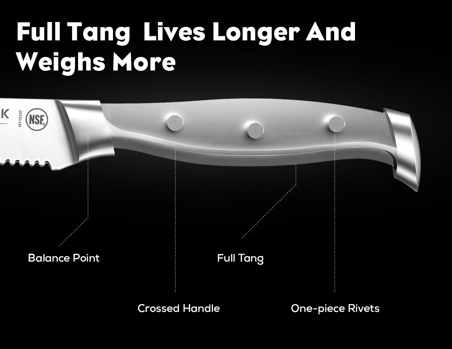 - Full Tang: The blade extends all the way through the handle, bringing great stability to these full tang steak knives. ABS material is embedded in the handle, with better anti-corrosion and heat resistance, replacing wood to prevent rot and funky odor
