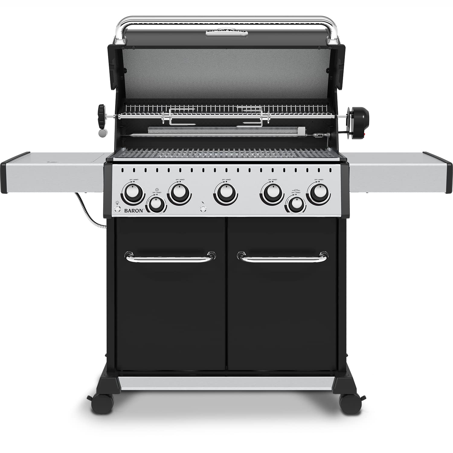 Details: The Baron™ 590 features 820 sq. in. total cooking space including the stainless steel warming rack and includes a durable cast aluminum oven. It has 8 mm stainless steel cooking grids, stainless steel Flav-R-Wave™ cooking system, 5 stainless steel Dual-Tube™ burners, stainless steel drop-down side shelves, and an enclosed cabinet base.