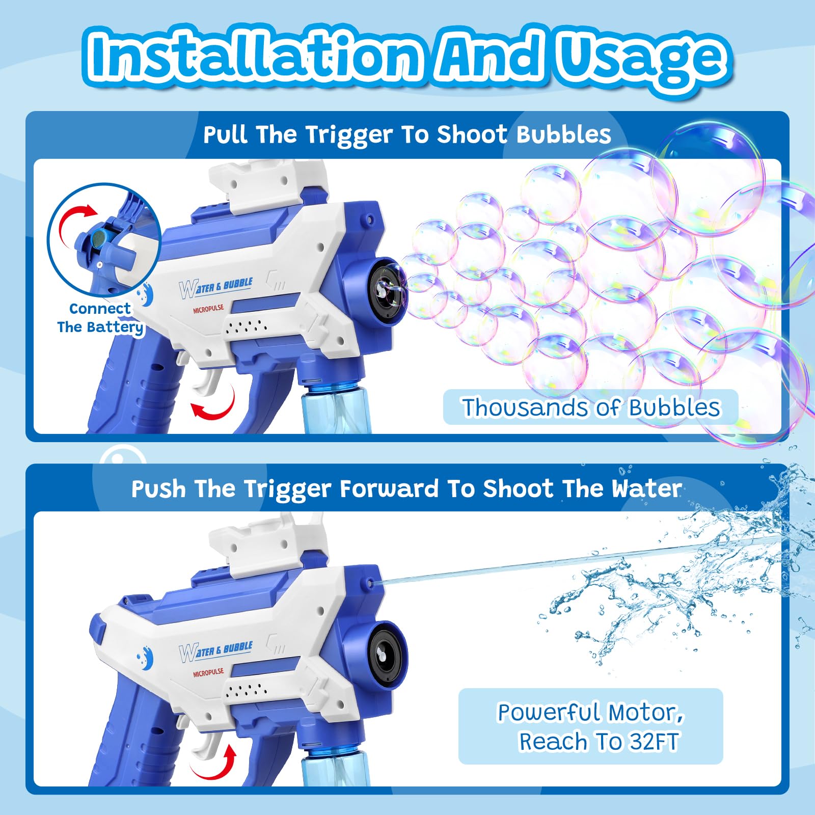 - [Package Include] This toy set include a 2 in 1 combination gun, 60ml bottle of bubble solution, 4 bags of bubble Refill Solution, 500ml large-capacity water tank & 50ml spare magazine, 2 rechargeable batteries; Totally offer two exciting functions and hours of entertainment time for kids and parents.