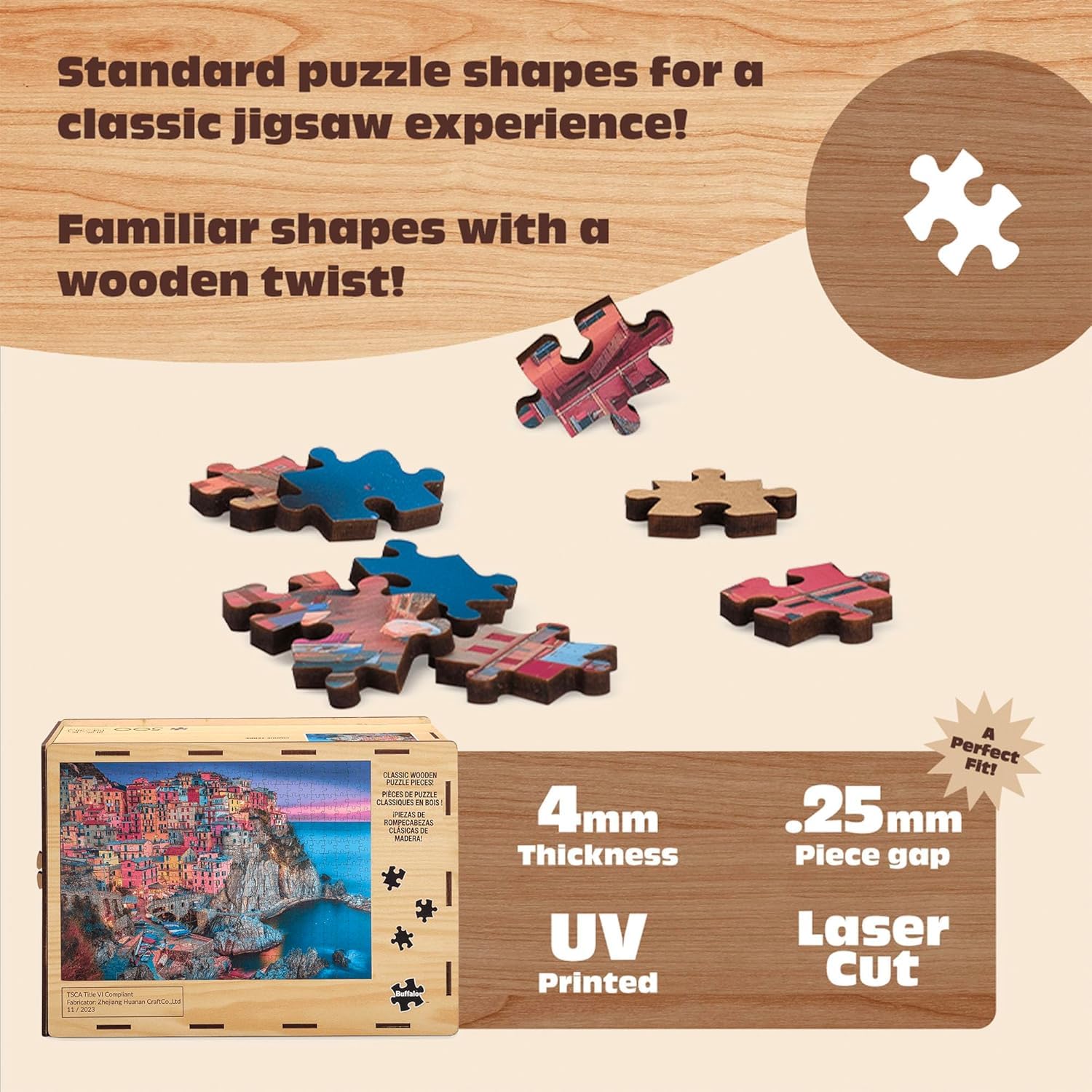 - STURDY AND BEAUTIFUL: Durable, classic wooden puzzle pieces cut to a standard jigsaw pattern or whimsy pattern will be the centerpiece of your puzzle collection.