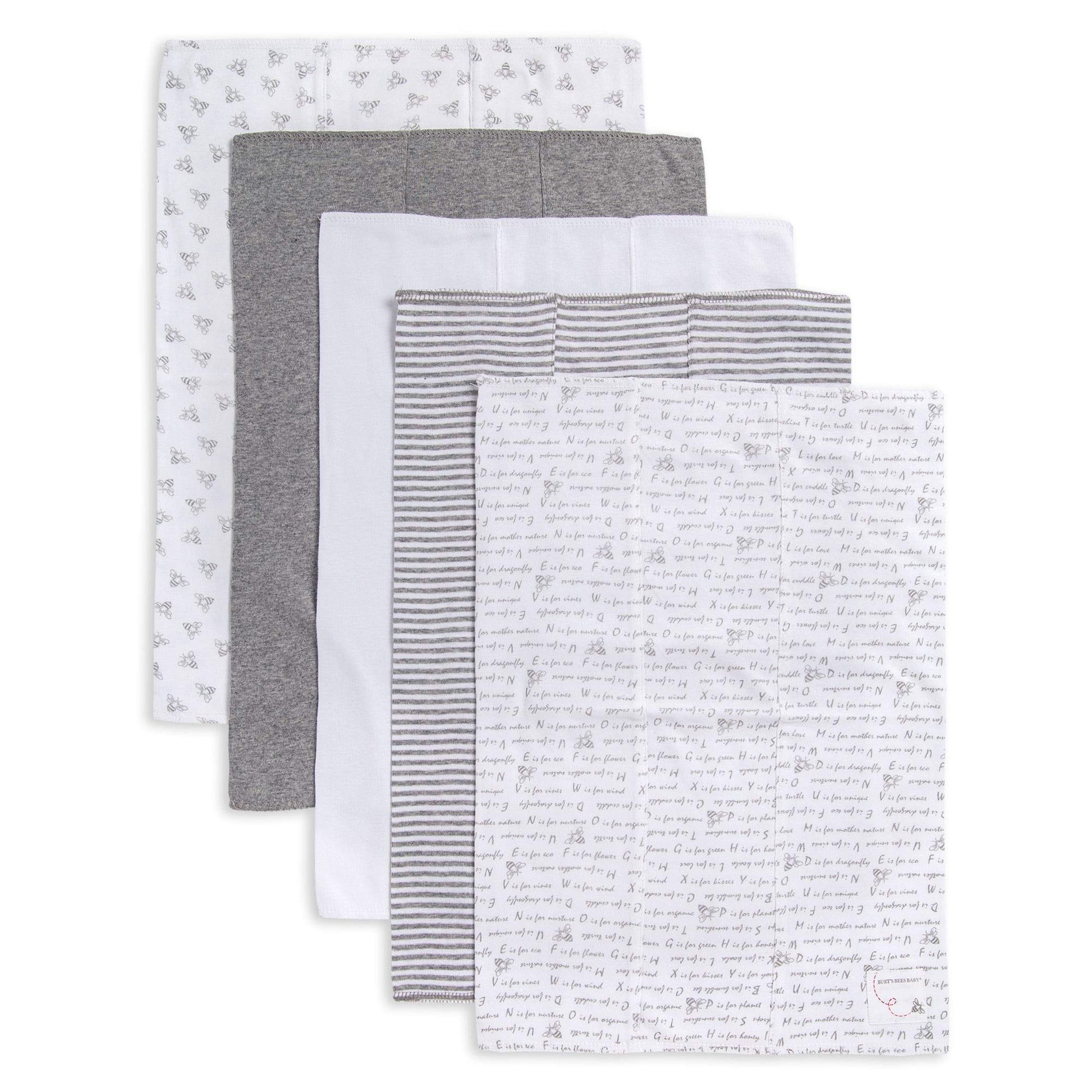 Burt's Bees Baby - 5 Pack of Burp Cloths, 100% Organic Cotton (1 Cloud, 1 Solid Color, 1 Honey Bee, 1 Stripe, 1 Alphabet Bee Print, Heather Grey)