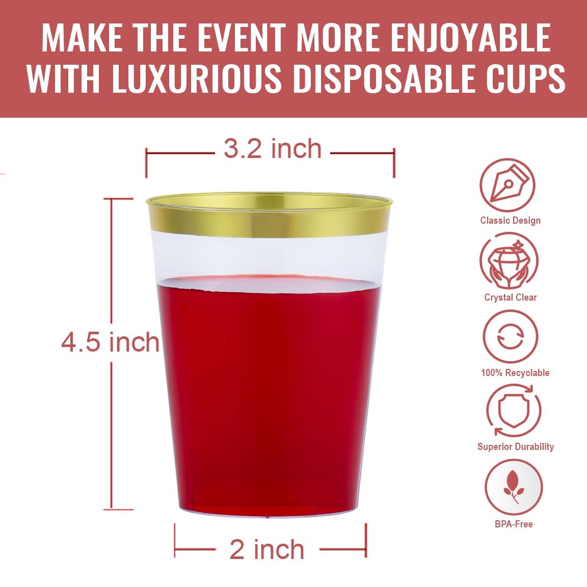 - Sophisticated Design: Madee's gold rim plastic cups exude sophistication, making them the perfect choice for parties, weddings and special events.