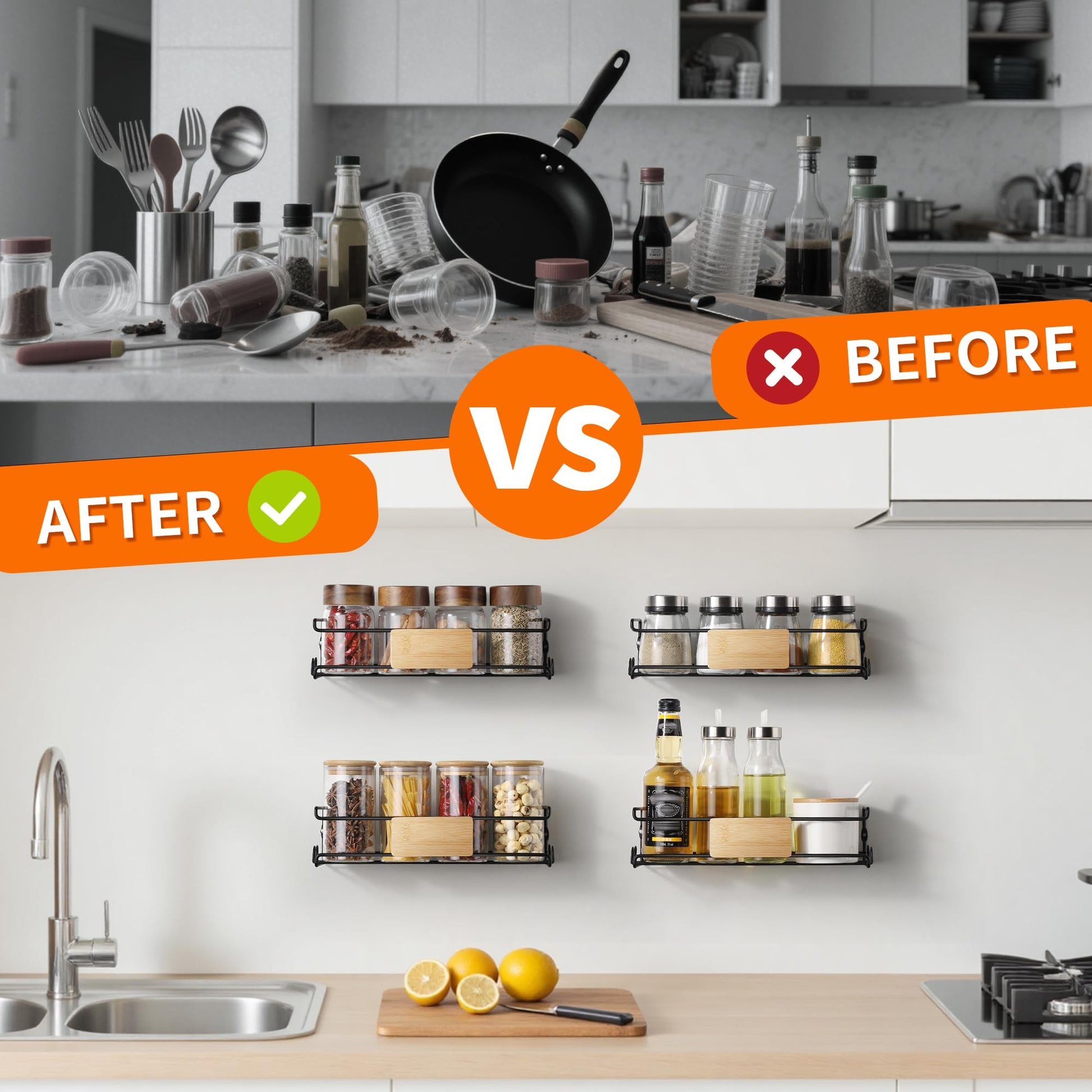 - 【2 Flexible Installation Options】This spice rack wall mount supports 2 installation methods to suit your needs and wall surfaces. Use the included adhesive backing for a no hassle, no drill setup that leaves no marks—ideal for renters or tiled walls. For a more permanent and secure installation, opt for the screw-mount option using the provided hardware. Both methods ensure the spice rack stays firmly in place without wobbling or falling.
