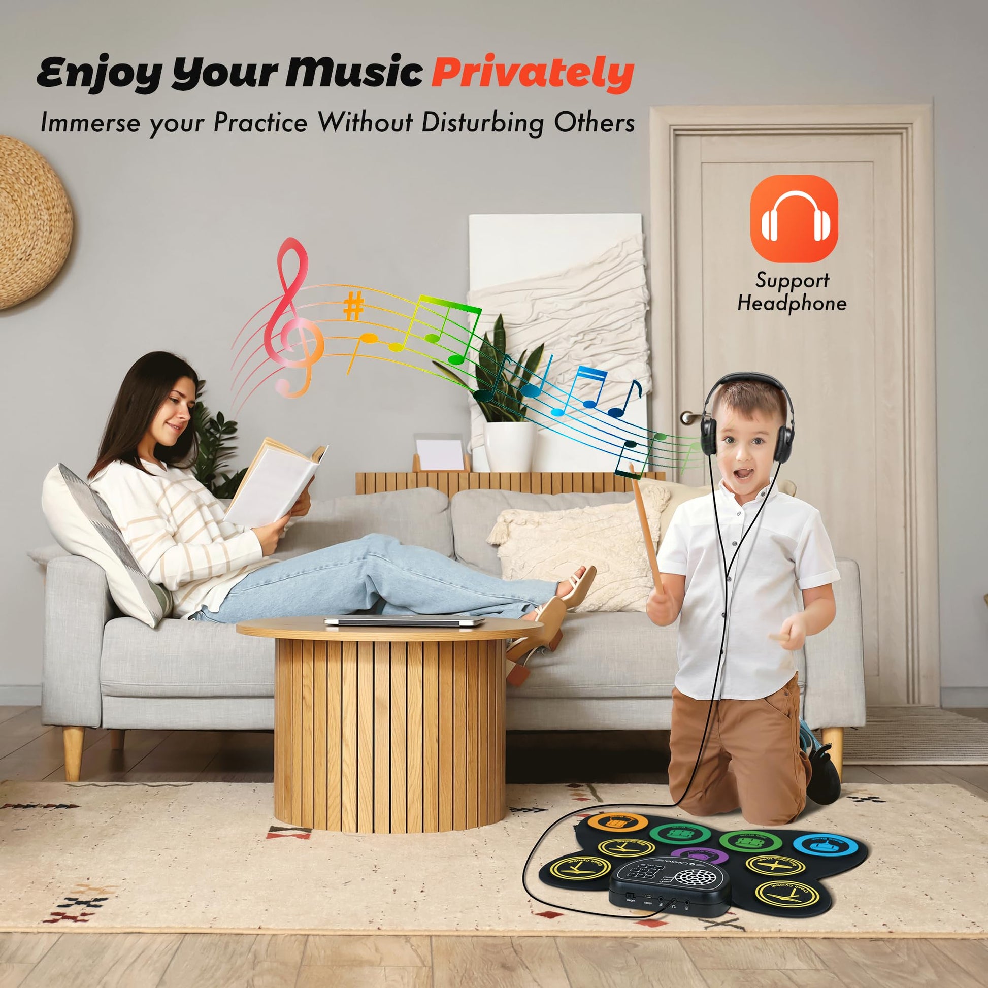 This electric drum pad is powered by a 1200mAh rechargeable battery, up to 10 hours playtime per charge, supports USB port power supply, plug and play, long working time allows it to be taken anywhere for outdoor party, camping ect. Enjoy the joy of music anytime anywhere.