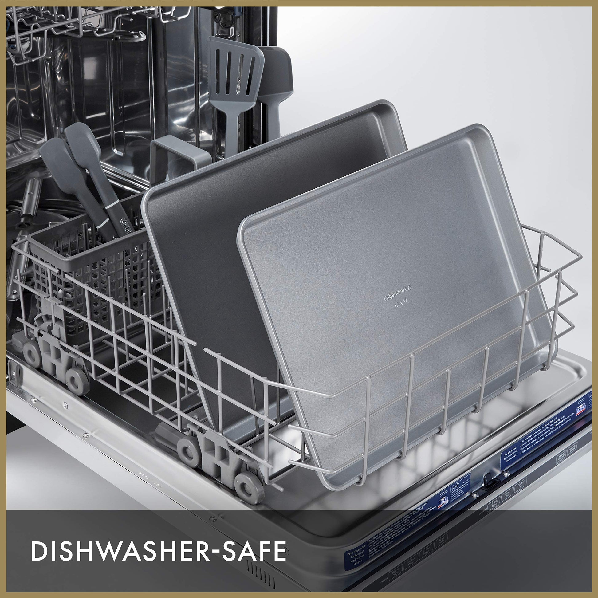 Details: Designed using heavy gauge steel core, this set of two Calphalon baking pans ensures evenly heated and perfectly browned cookies, cakes, and more. Its interior has interlocking nonstick layers, offering up to 2X better release than Calphalon Classic Bakeware, leading to long-lasting, high-performance usage. Raised edges on this baking sheet facilitate a no-spill baking experience, making it versatile for everything from cookies to sheet cakes. Finish your baking session with an easy cleanup, thanks to its dishwasher-safe properties and excellent reliability backed by Calphalon's full lifetime warranty.