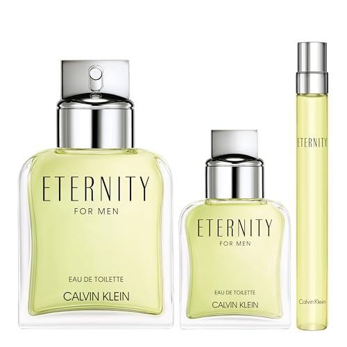 Details: Calvin Klein Eternity Eau de Toilette. Distinctive. Romantic. Timeless. Experience fresh bergamot and mandarin, earthy florals and rain-drenched moss. A refreshing fougère fragrance, balancing top notes of mandarin, sage and galbanum with a heart of basil, geranium and lavender, grounded in masculine cedarwood, moss and amber. This Eternity for Men gift set includes: - Eternity 100ml (3.3oz) Eau de Toilette for Men - Eternity 30ml (1oz) Eau de Toilette for Men - Eternity 10ml (0.33oz) Eau de Toilette for Men