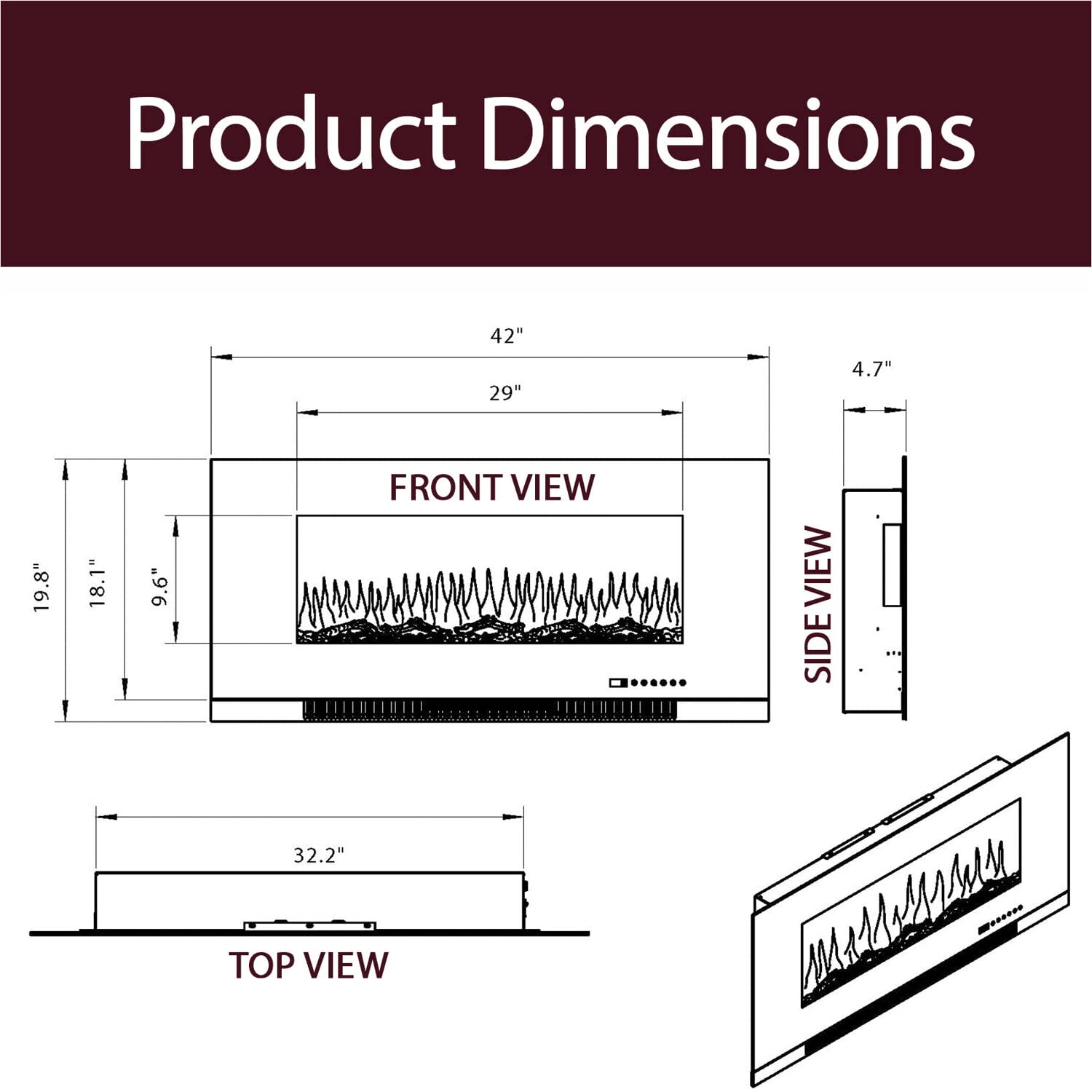 - Heat Settings: The 42 inch indoor fireplace has 2 heat settings: 700W (low) / 1350W (high); Additionally, the fireplace is installed with a fan-forced air heater that provides built-in overheat protection