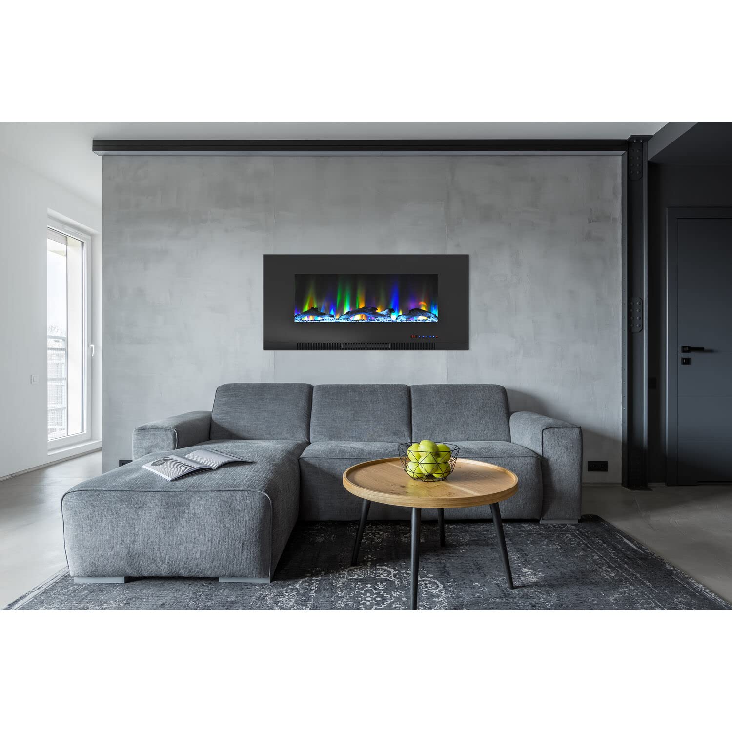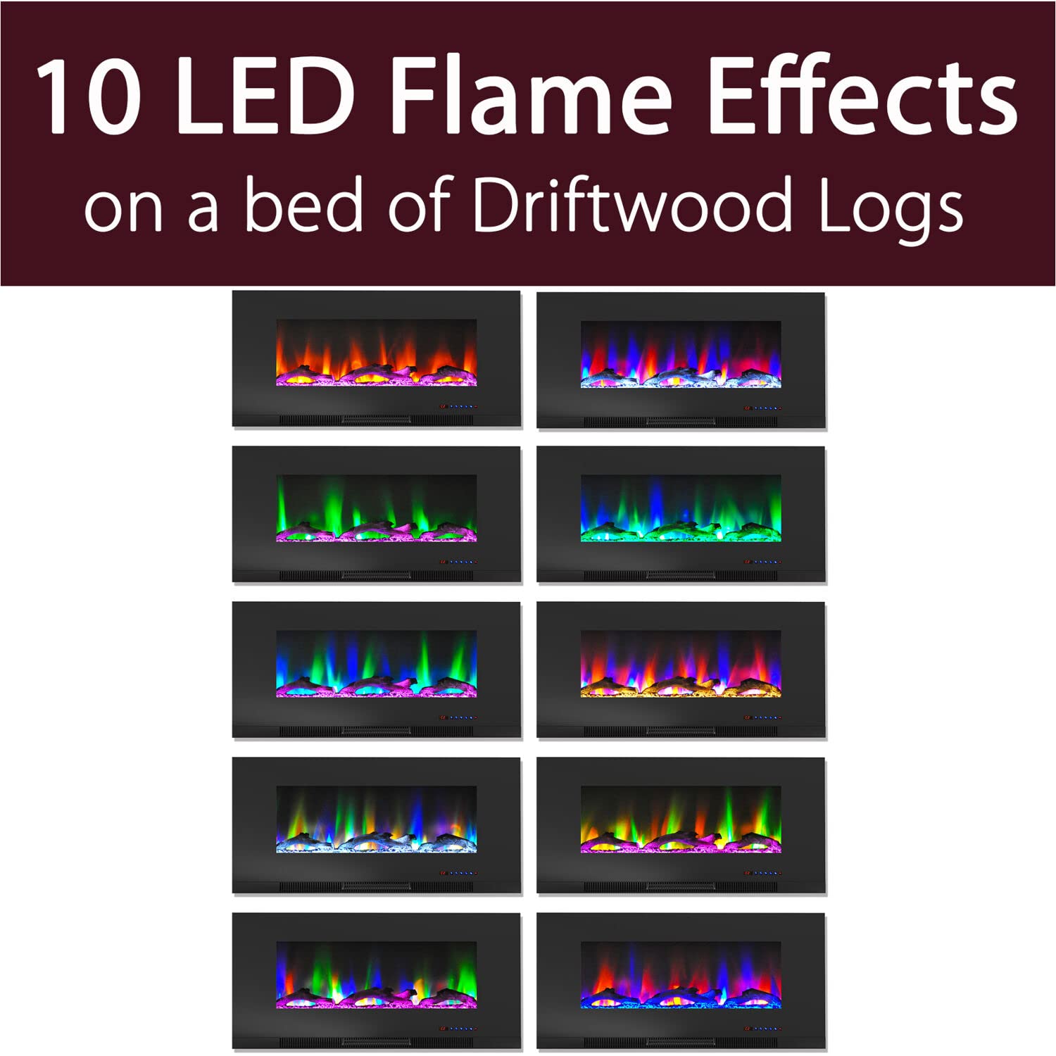 - Key Features: The color changing wall mounted fireplace filters through 10 LED Flame Color Effects that display over a bed of wooden logs; The fireplace includes a remote control for convenience in adjusting the temperature or settings
