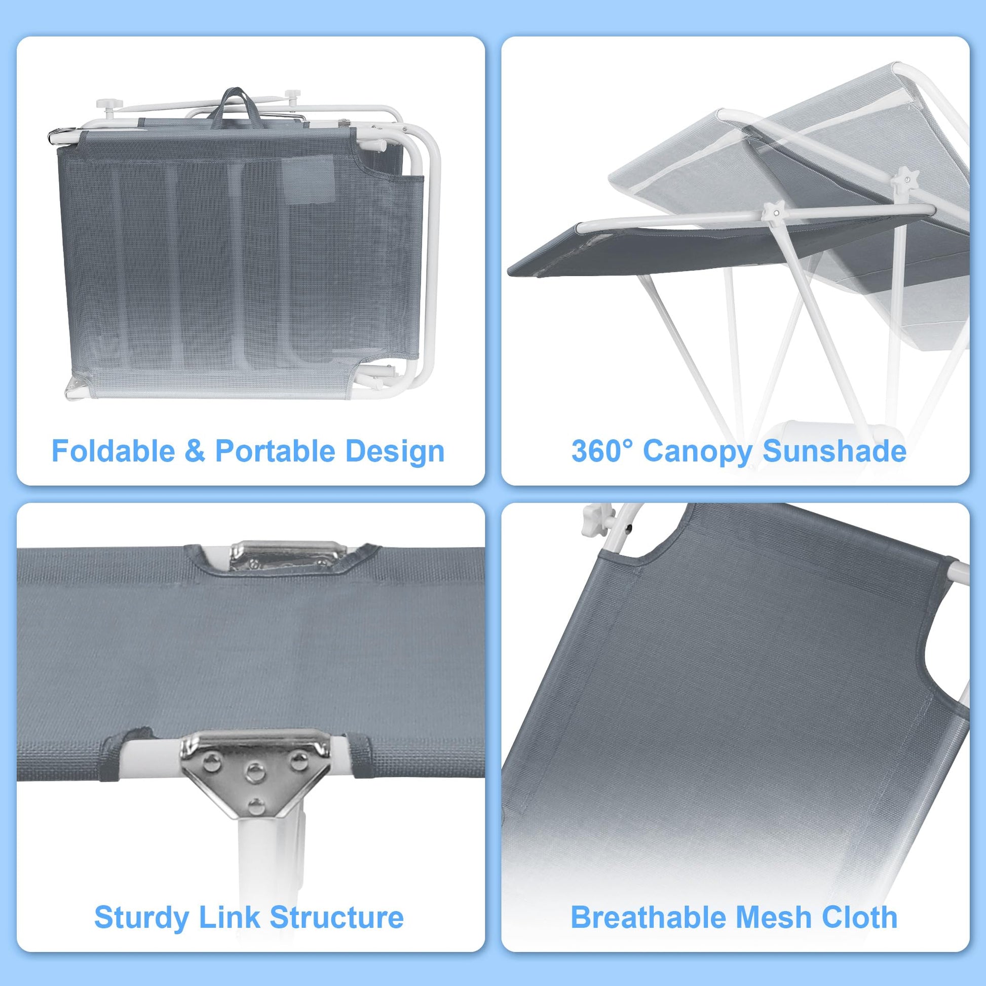 - 【360° REMOABLE SUNSHADE】Different from common ones, this Northroad beach lounge chair coming with a sun proofed sunshade, you can sunbathe on our beach recliner without getting dazzled. The sunshade is 360-degree adjustable and can be removed if you feel like not using it.