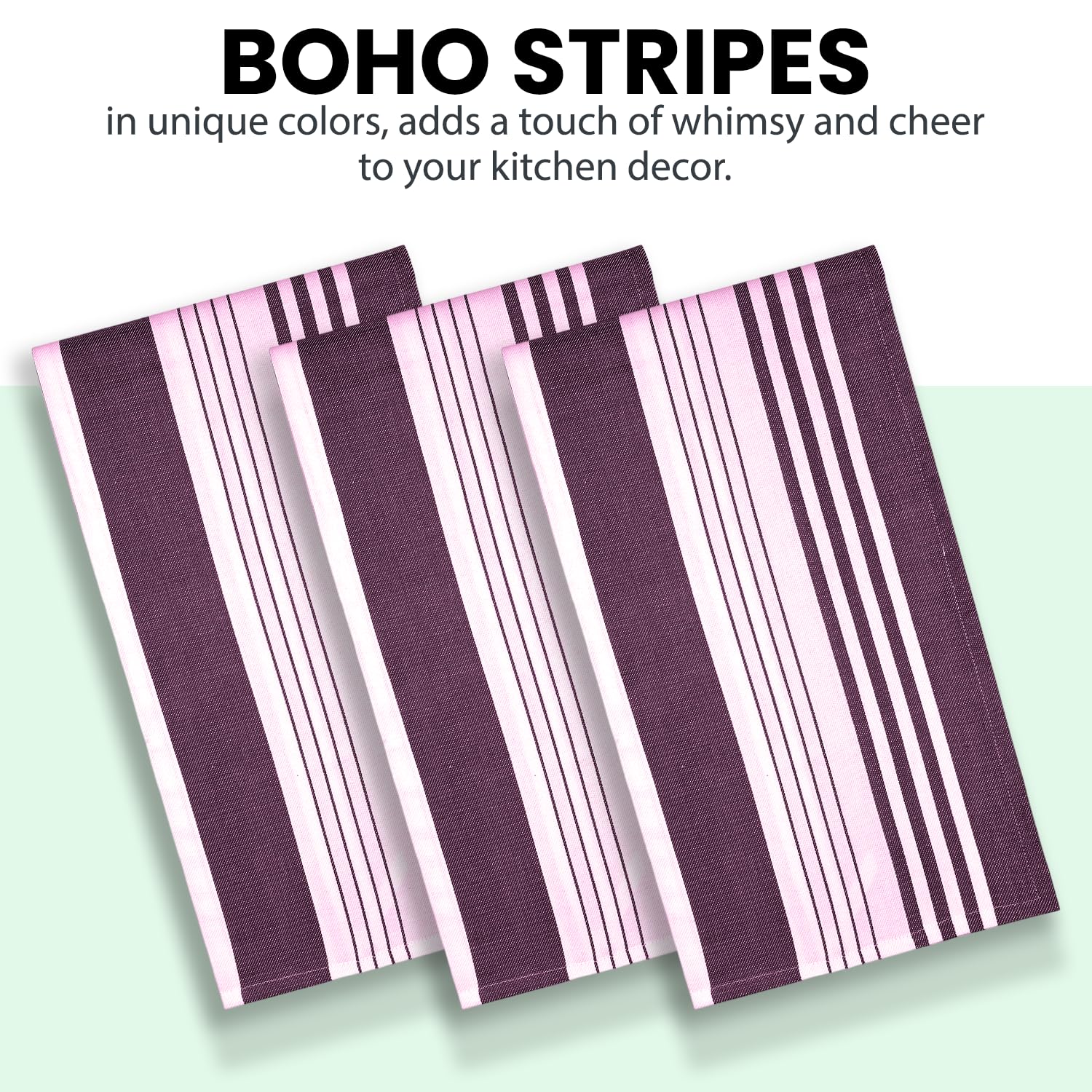 - VERSATILE: Kitchen Towels functionality extends far beyond just drying dishes. These handy towels can be used for a myriad of tasks in the kitchen and beyond.From wiping down countertops to cleaning up spills, they swiftly absorb liquids, keeping surfaces clean and dry.They act as reliable pot holders, protecting hands from hot handles and surfaces.Their soft and gentle texture makes them ideal for drying hands or faces, and they can even be repurposed as makeshift placemats during casual meals.Trendy Stripes weave with Unique colours stripes adds attractive looks to your kitchen.