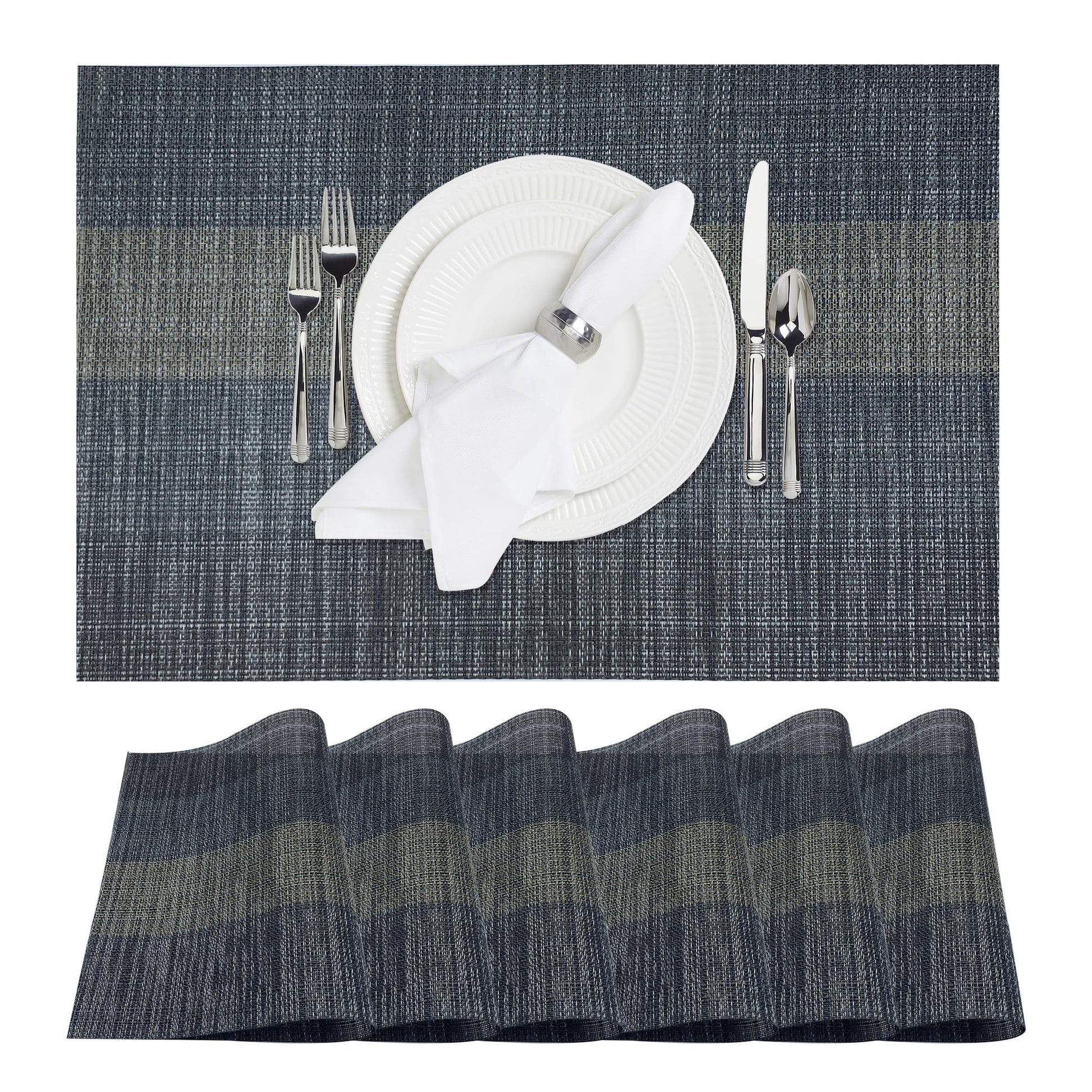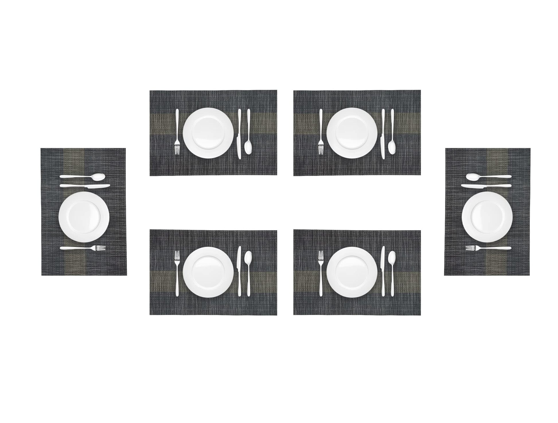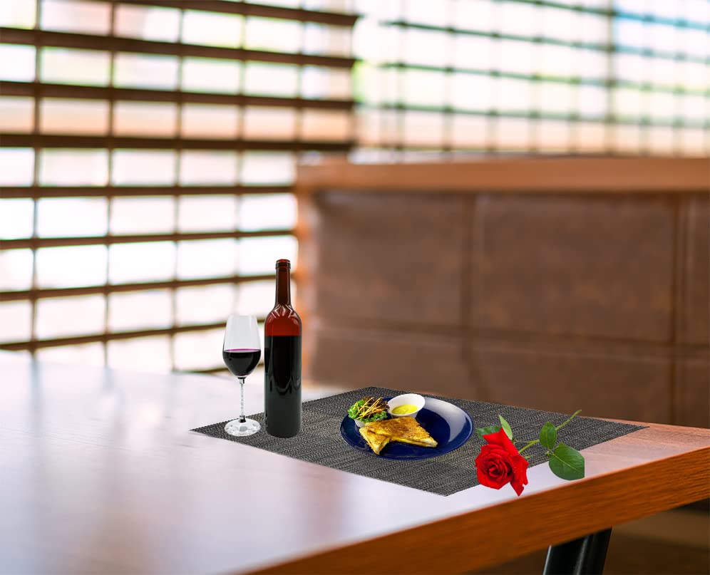 - šćPlacemat Sizeć Environmental black placemats set of 6,size 18x12 inch (45x30cm), Material: Woven with high quality eco-friendly materials, 70% PVC and 30% polyester, reusable, all placemats are hand cut.