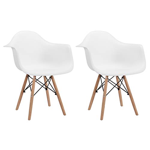 CangLong Natural Wood Legs Mid Century Modern Molded Shell Lounge Plastic Arm Chair for Living, Bedroom, Kitchen, Dining, Waiting Room,2 PCs Pack- White, Set of 2, White