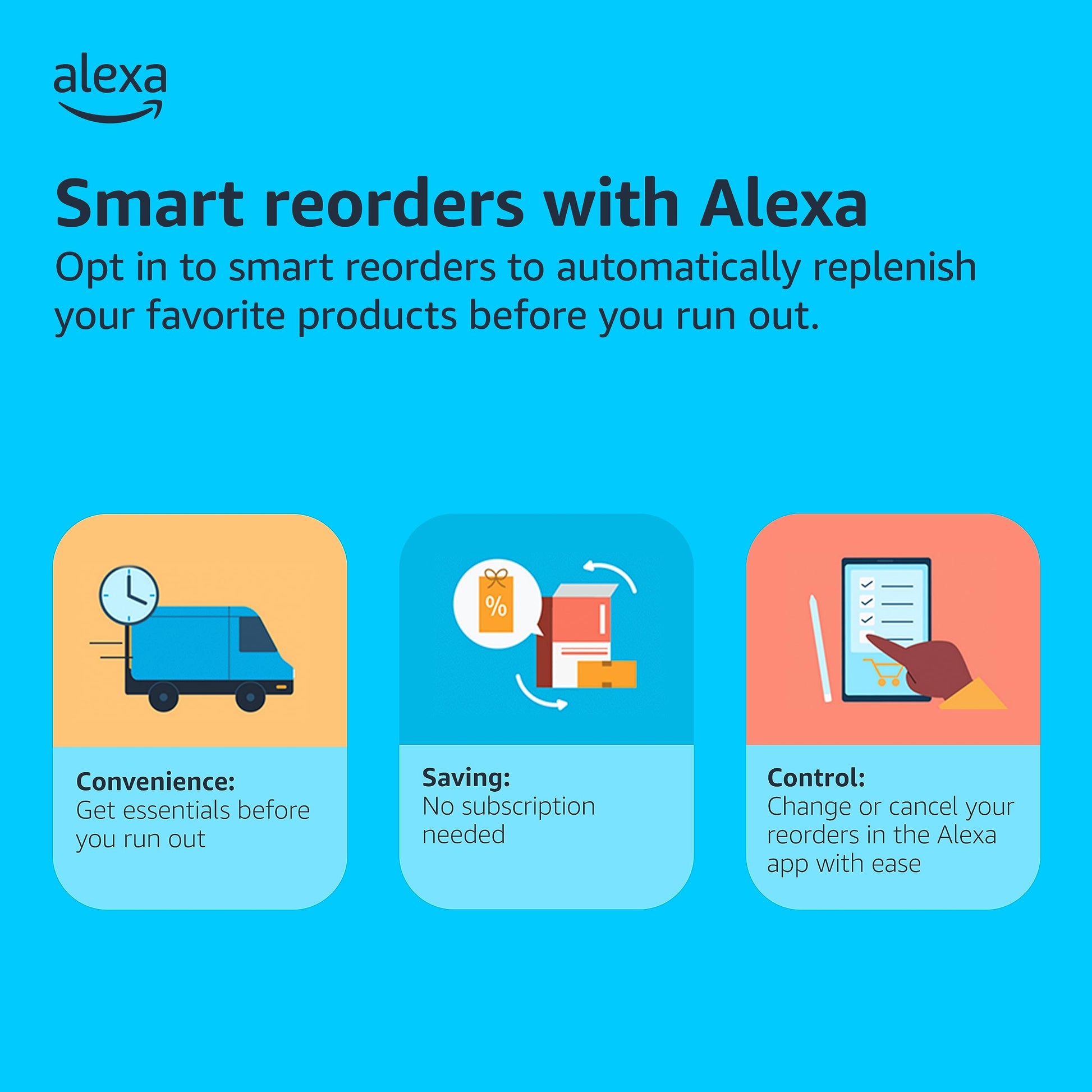 • Enrolling in smart reorders with Alexa ensure that you never have too much or too little ink or toner. No subscription needed.