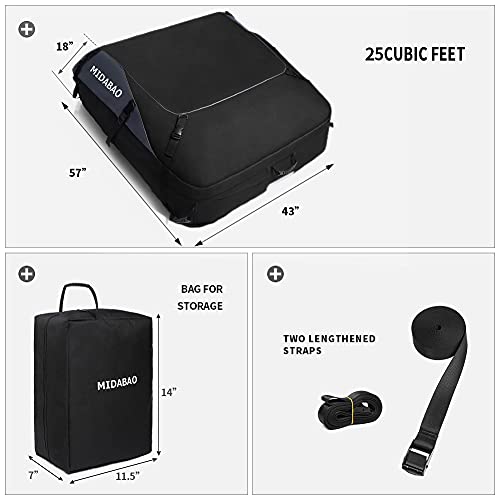 - Roof bag was designed to solve the problem of limited storage space in the car. 25 cubic feet rooftop cargo bag allows you to hold 8-10 suitcases, travel luggage case, tents, sleeping bags and more. Free up inside vehicle space for more comfortable on the way.