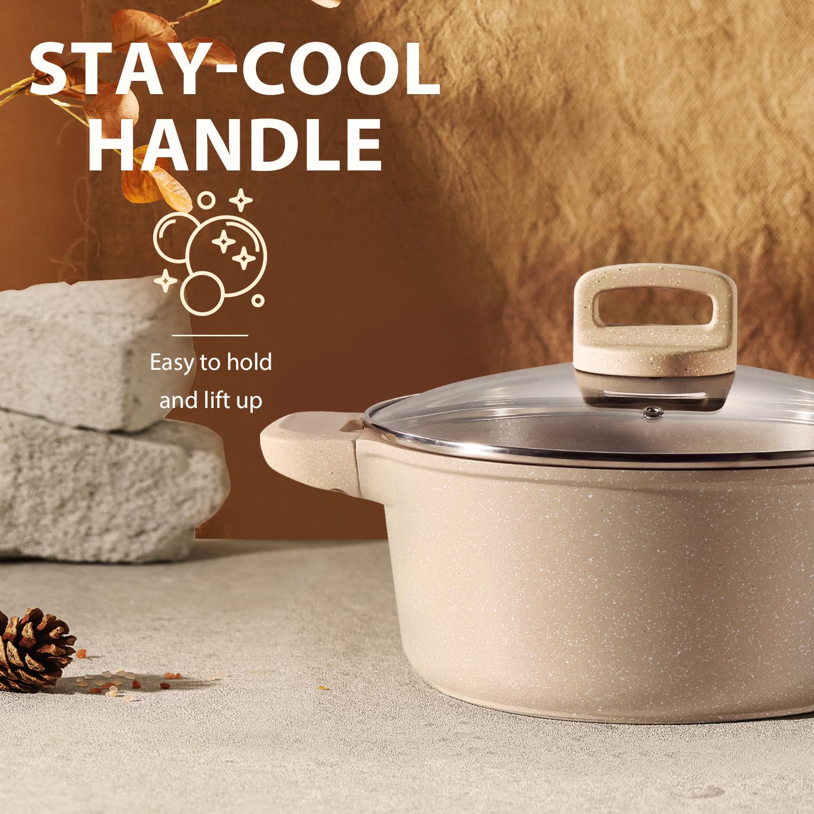 - STAY-COOL HANDLE - Every pan and pot is equipped with bakelite handle which would keep cool during cooking, keeping you safe from heat.
