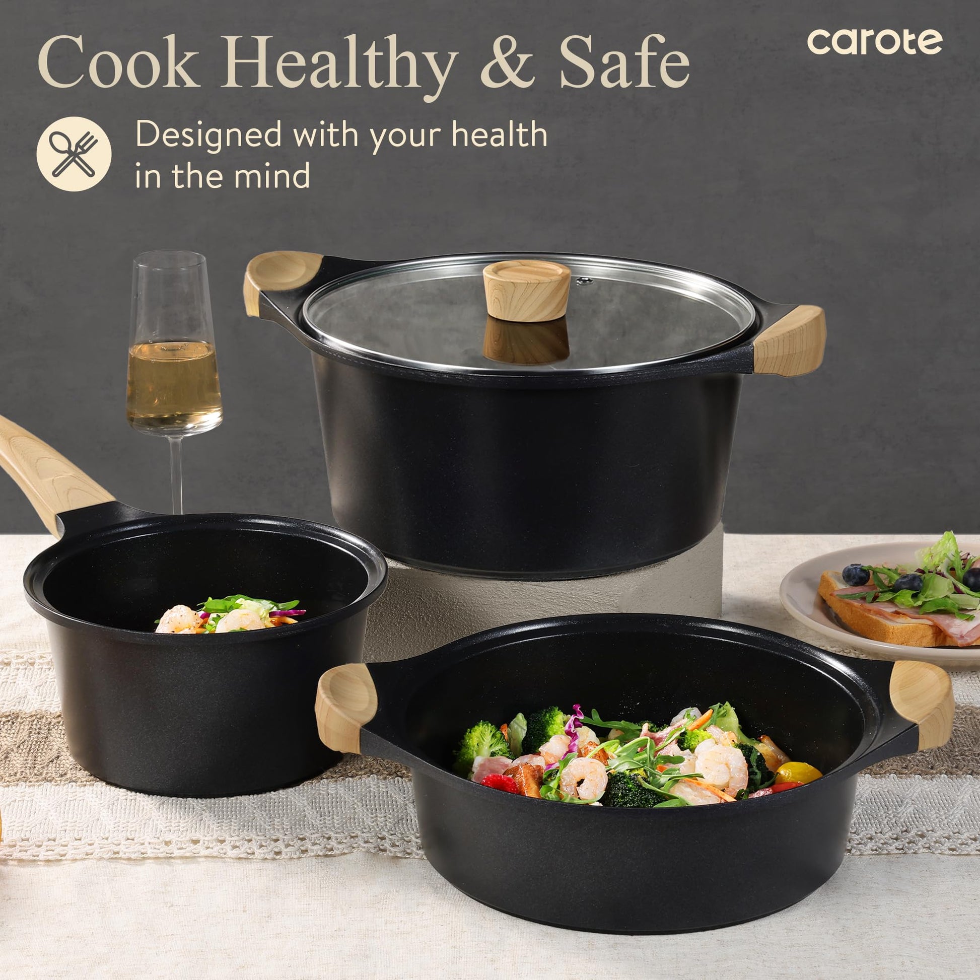 - Cook Healthier:Our cookware sets are free of PFOA, PFOS, and the other harmful chemicals. You can enjoy your cooking on carote cookware safely & easily.