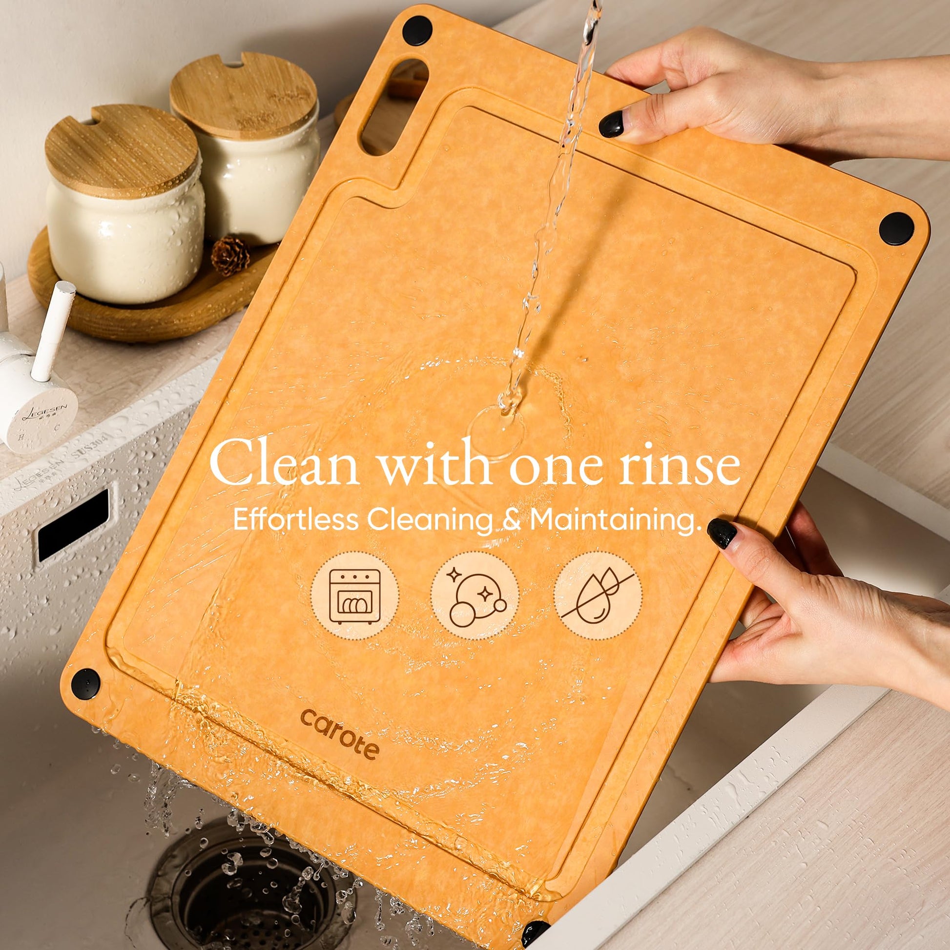 - Complete Kitchen Knife Set with Cutting Board: This knives set for kitchen includes all essential kitchen knives along with a high-quality wood fiber cutting board. The board features anti-slip feet and a juice groove to prevent messes, while its durable surface helps maintain the sharpness of your kitchen knife collection.