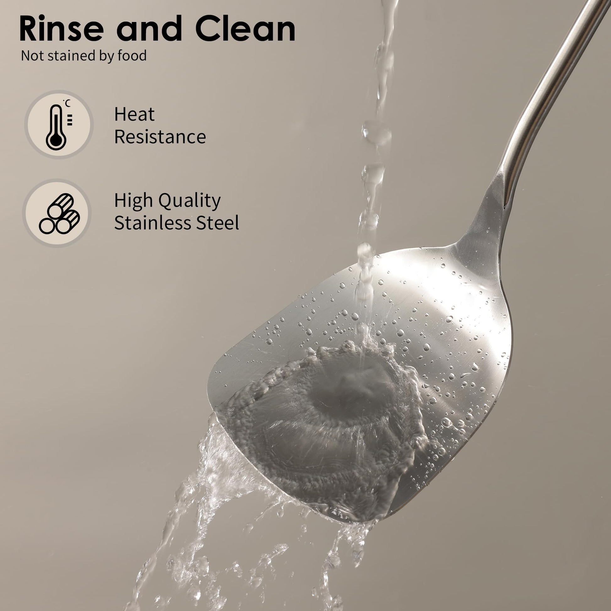 - Premium Stainless Steel for Durability: Crafted with premium food-grade stainless steel, these stainless steel cooking utensils are stain-resistant, rust-proof, and incredibly easy to clean. Simply rinse and wipe clean for effortless maintenance.