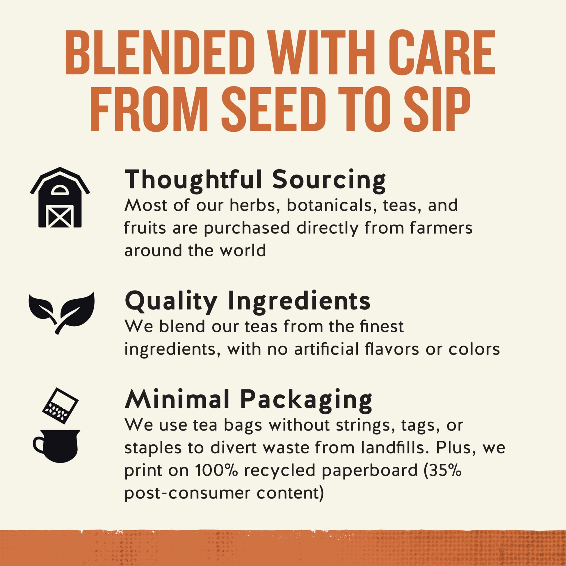 - Minimal Packaging: We use tea bags without strings, tags, or staples to divert waste from landfills. Plus, we print on 100% recycled paperboard (35% post-consumer content).
