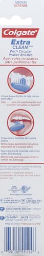 Details: Colgate Extra Clean manual toothbrush is designed with circular power bristles to help remove tooth stains. Its cleaning tip bristles effectively reach and clean back teeth and between teeth. It also has an easy-to-grip handle to provide comfort and control while brushing. Remember to change your toothbrush every 3 months.