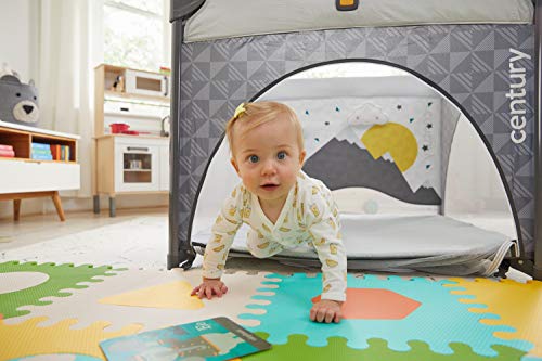 Details: It's hip to be square, baby! The Century® Play On™ 2-in-1 Playard and Activity Center features a spacious square design with breathable mesh sides and a zippered door for free-play mode and easy in and out. We call this one "The Creative Cube." The adorable mountain GoPlay™ Playscape on one wall features two removable toys—a soft airplane and a happy little cloud—for peak fun on endless imaginary adventures. But the thing we're most proud of? As part of our Happy Planet Collection, this playard is crafted with fabrics made with recycled materials—part of our Do More™ promise to Recycle, Reimagine, and Give Back.