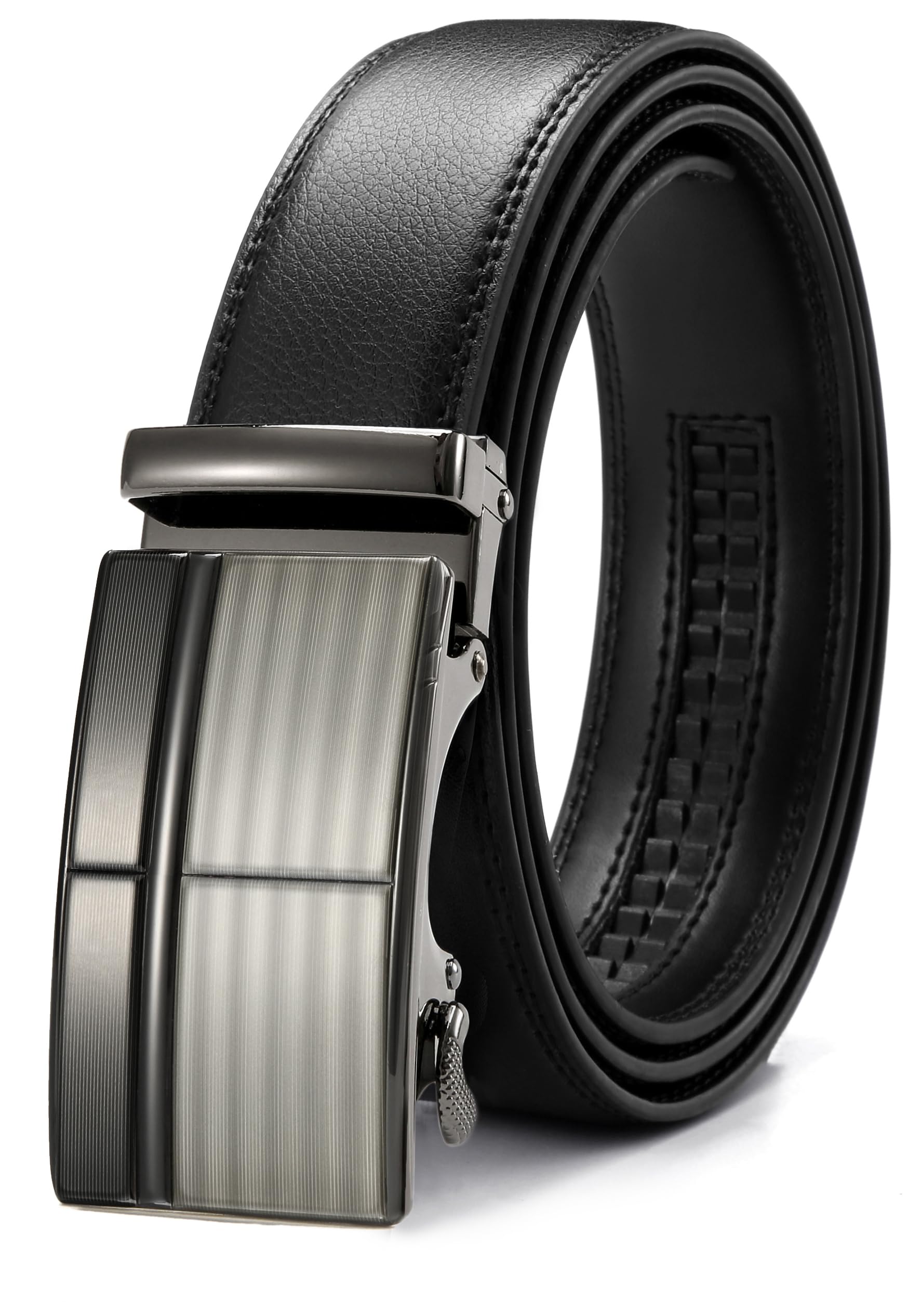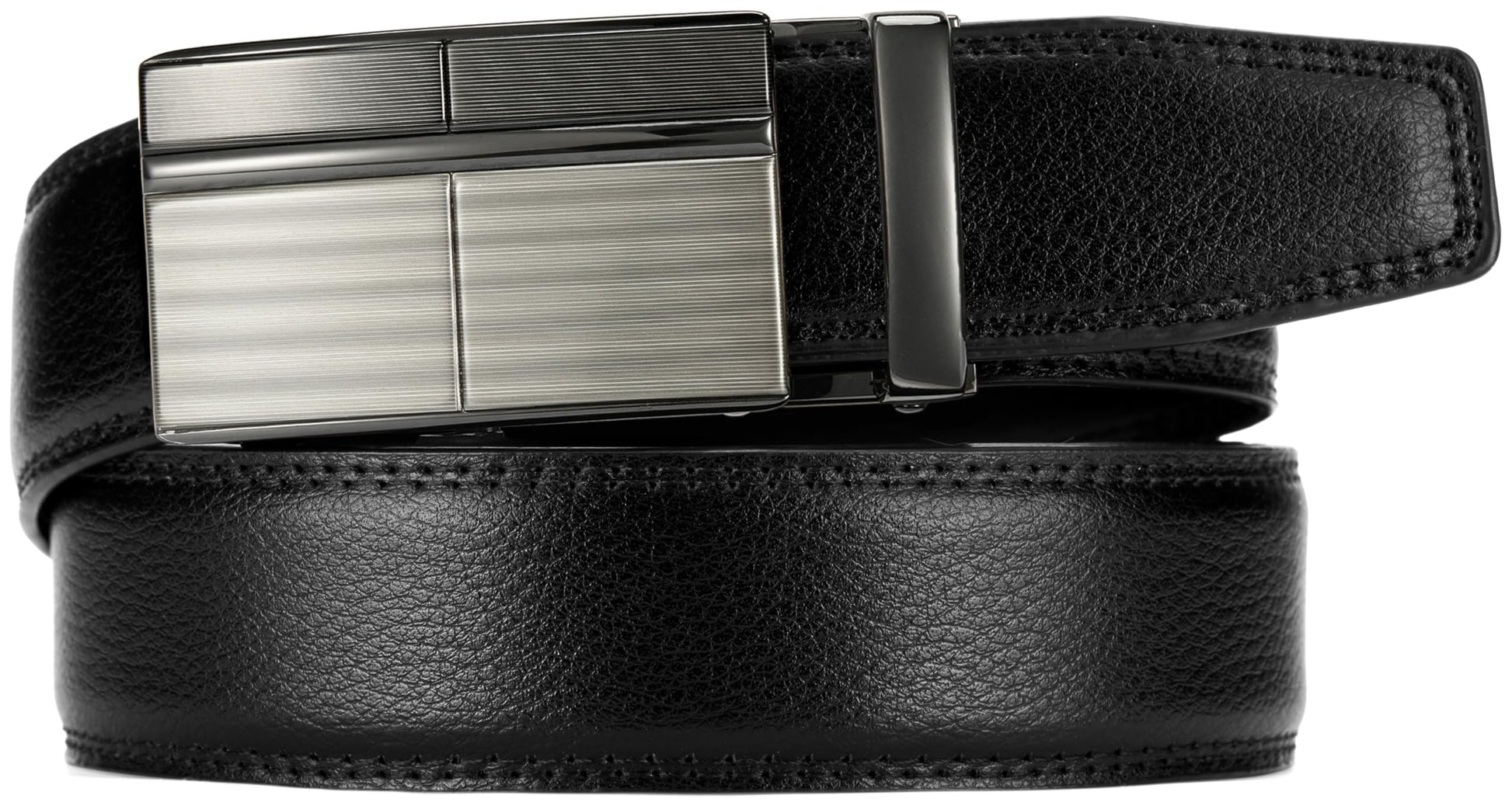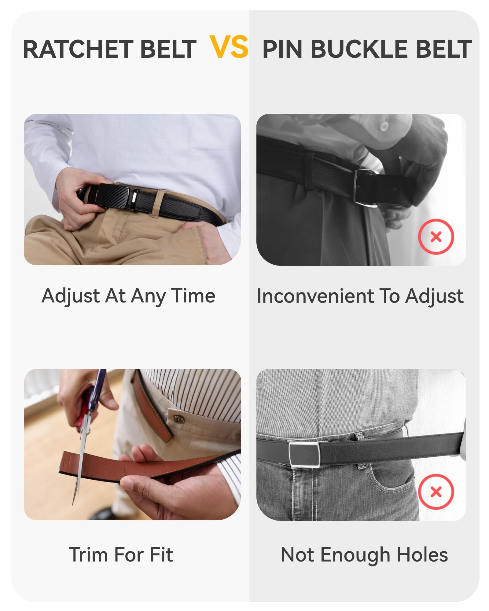 - Effortless to Use: Experience the ultimate convenience with our black leather belt. Simply slide it into the sliding buckle, pull it through, and the click-it buckle automatically locks in place. Releasing the belt is just as easy - gently push the lever on the side of the automatic buckle, and the lock snaps shut. Enjoy the seamless simplicity and smoothness of our ratchet belt design.