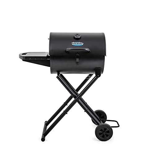 Details: Grill on the go with the King-Griller E1816 Gambler Portable Charcoal Grill. Equipped with cast iron grates for superior heat retention and flavor, the Gambler has 320 sq. in. of grilling space. Premium features like an Easy Dump Ash Pan for quick clean up and a side shelf for extra storage, the Gambler can handle game day, the camping trip and much more. It’s folding cart design makes it easy to set up and simple to fold up and take on the go. The large wheels and integrated handle in the side shelf means its ready to go whenever you are.