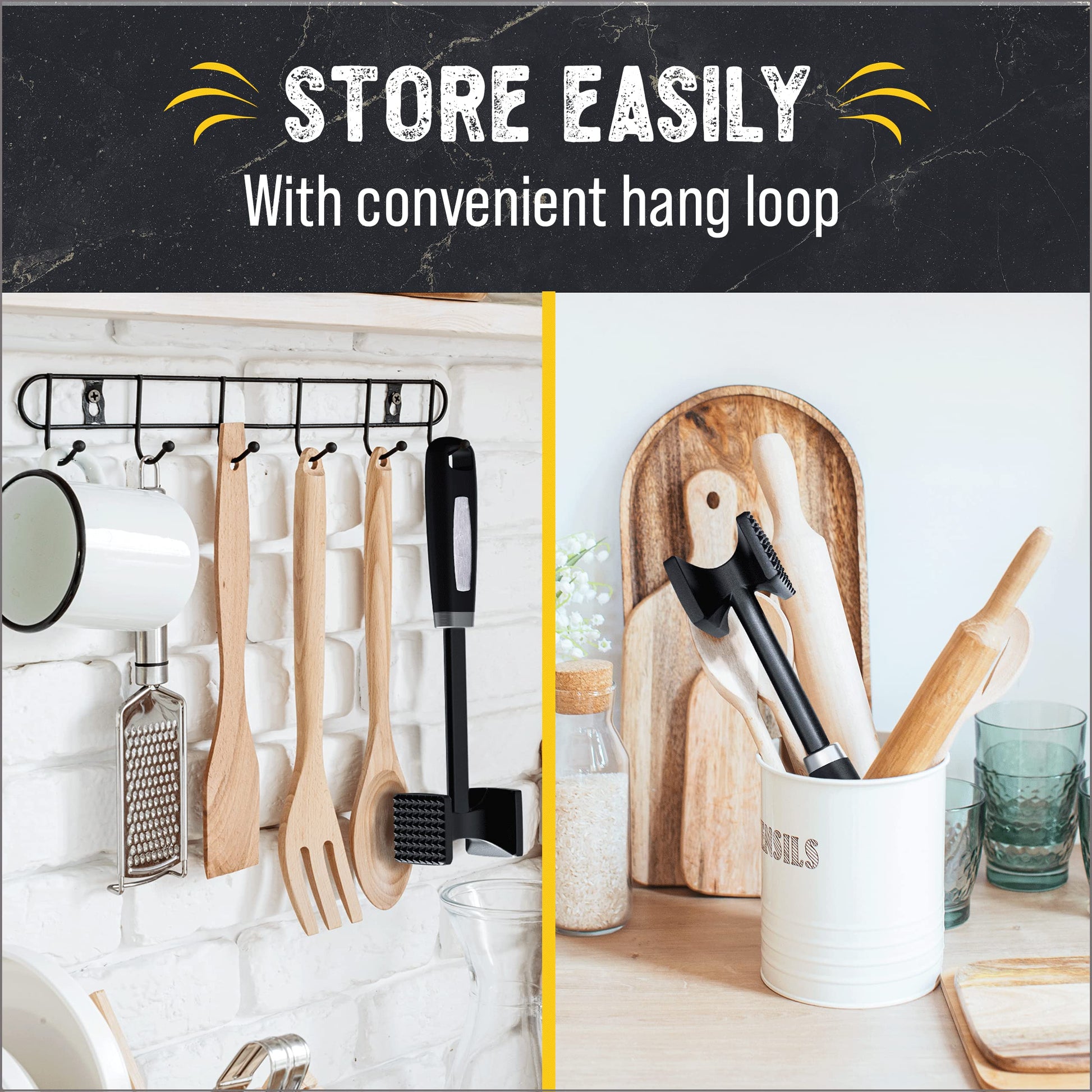 - No-Slip Grip: Don't let your meat tenderizer tool fly off the handle! This food hammer comes with a sturdy grip that prevents it from slipping out of your hands. The grip includes an opening you can use to hang the meat / chicken tenderizer.
