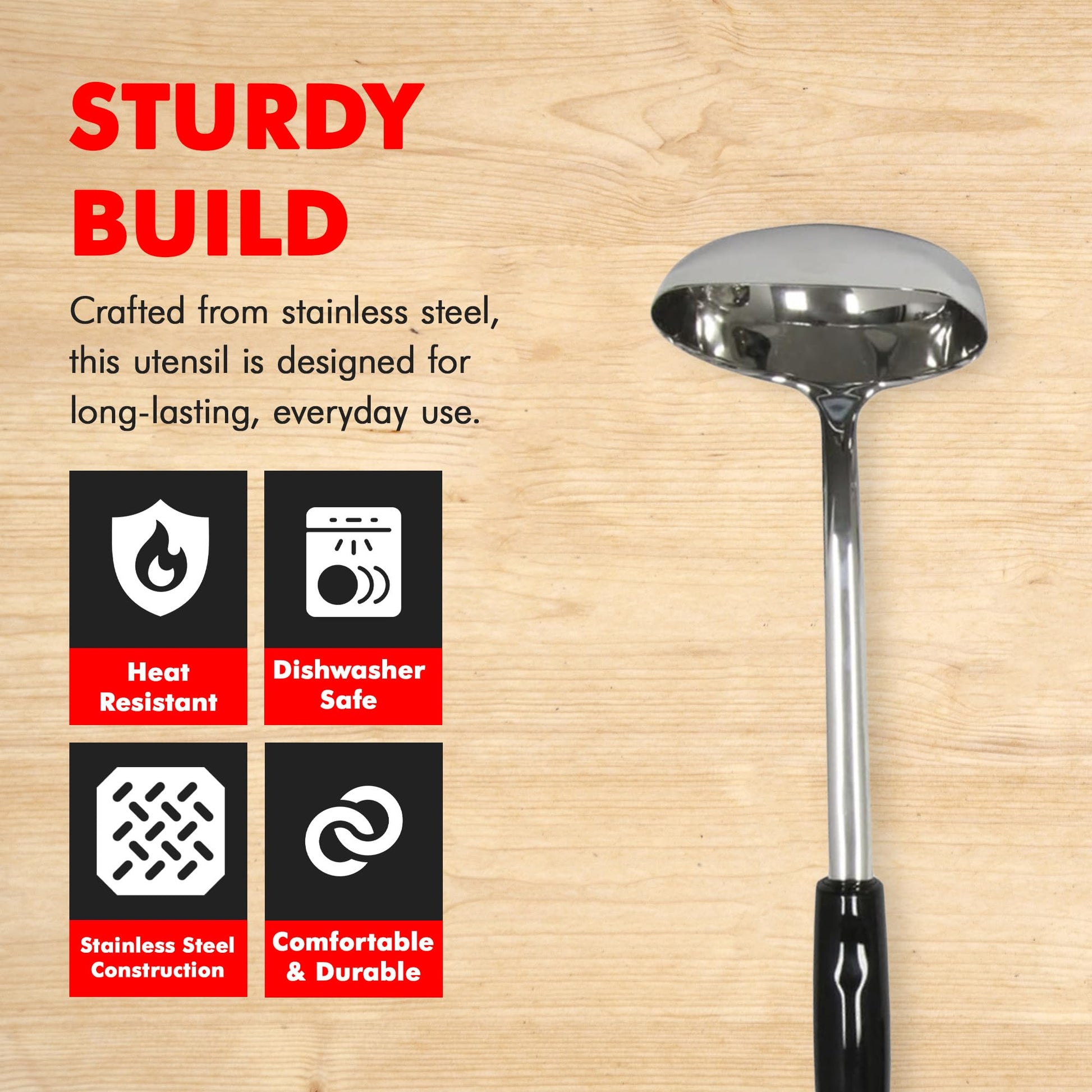 Details: The Chef Craft Heavy Duty Select Stainless Steel Ladle is very durable along with being dishwasher safe. The stainless steel construction is resistant to rust. It is constructed of a single sheet of stainless steel to lend durability while the ergonomic plastic handle is comfortable to use. The 13 inch length is the perfect length to reach the bottom of a pot while still maintaining control of the working end.