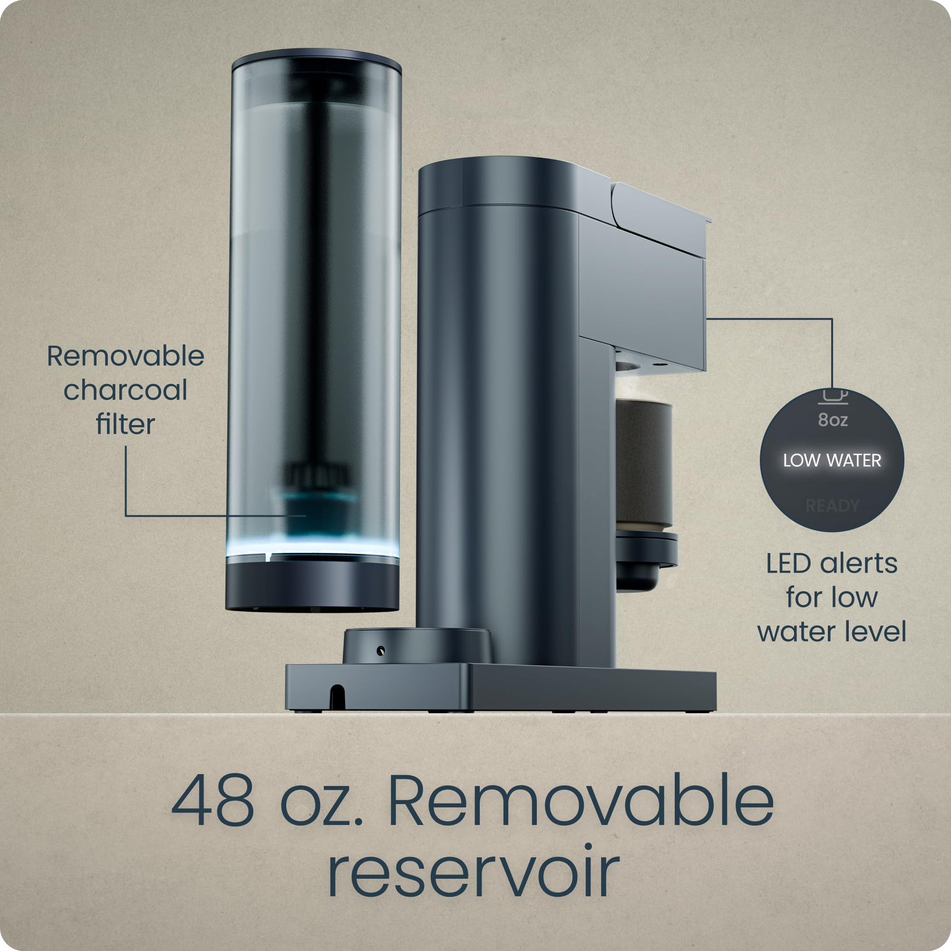 - 48 OZ. WATER RESERVOIR: Don’t worry about refilling the water reservoir; just remove it from the drip coffee maker to easily refill in the sink. The 48 oz. water tank comes equipped with a charcoal water filter to keep your java tasting perfect.