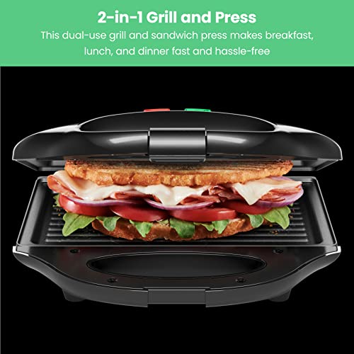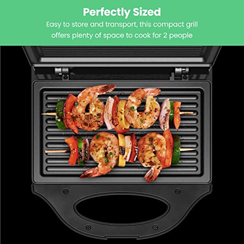 - PERFECTLY SIZED: This compact, portable electric grill and sandwich press takes up minimal space on your counter while providing enough grill area to cook for 2 people.